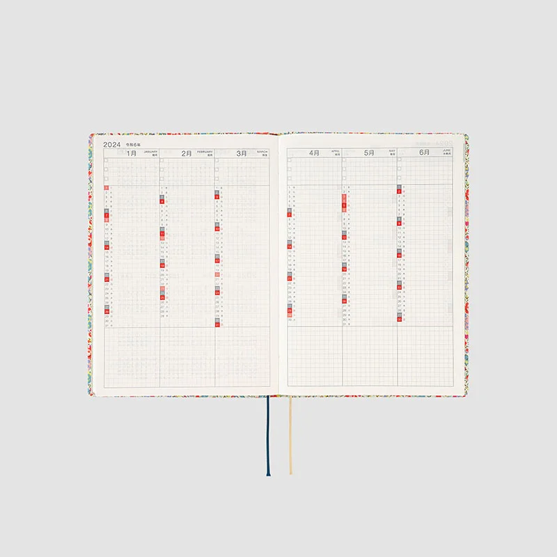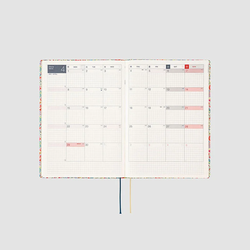 The Hobonichi Techo HON has a hardcover design already attached to the book. It’s designed to make you feel like you’re carrying around a favorite book, which you can pull out at any time to make notes no matter where you are. The book has A5 size pages with plenty of space to write and paste, and features a page per day, so the contents are the same as the Hobonichi Techo Cousin.