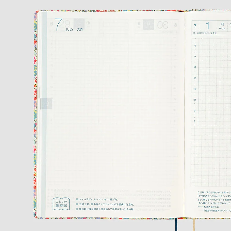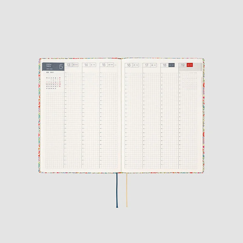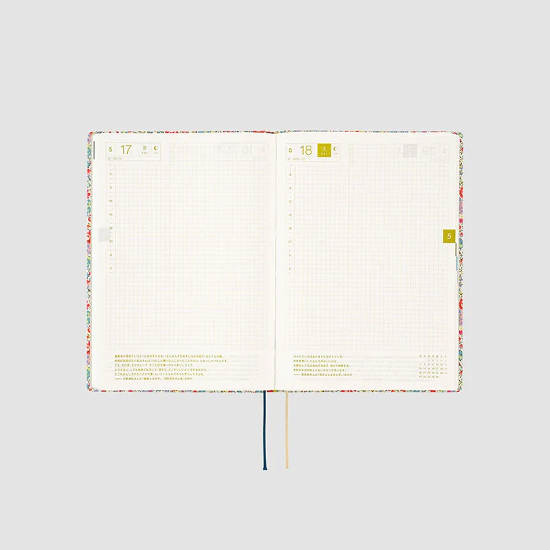 The contents are the same as the Hobonichi Techo Cousin book. The HON A5 size includes weekly pages which track a week in each two-page spread for easy planning and contain a handy time schedule.