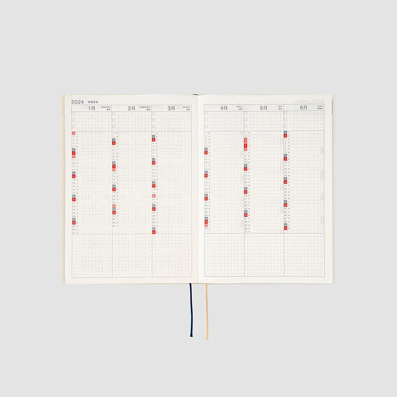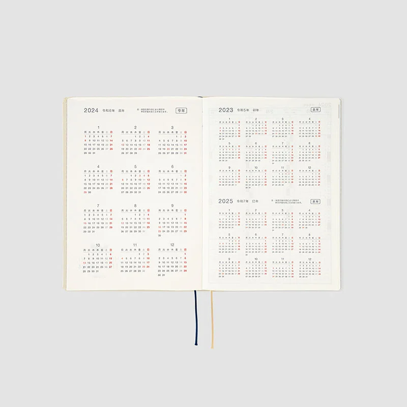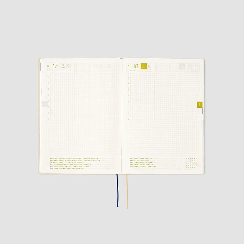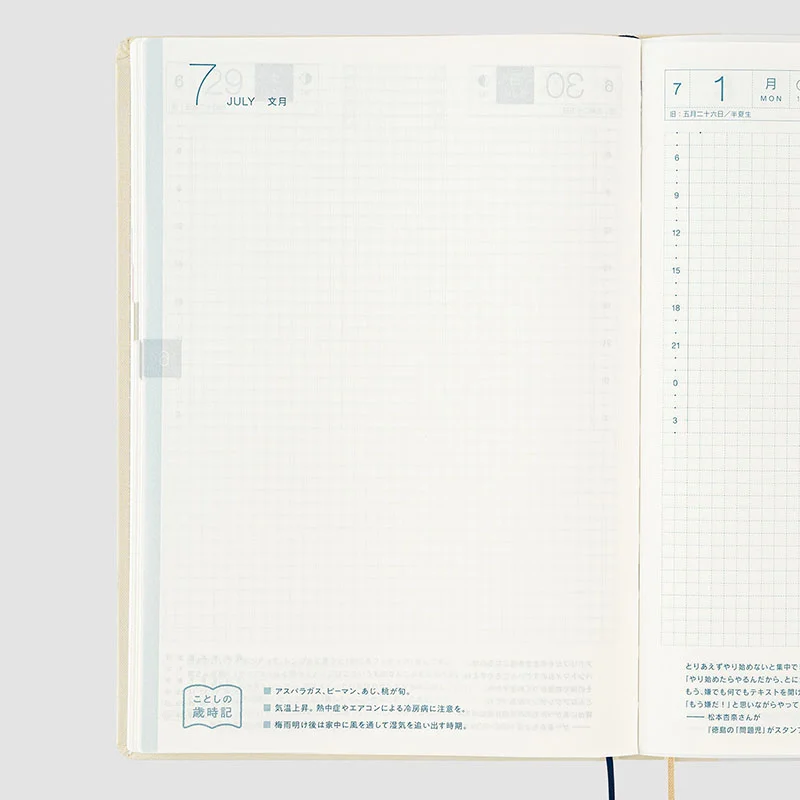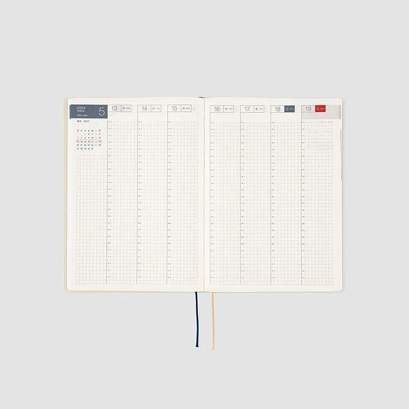 The contents are the same as the Hobonichi Techo Cousin book. The HON A5 size includes weekly pages which track a week in each two-page spread for easy planning and contain a handy time schedule.