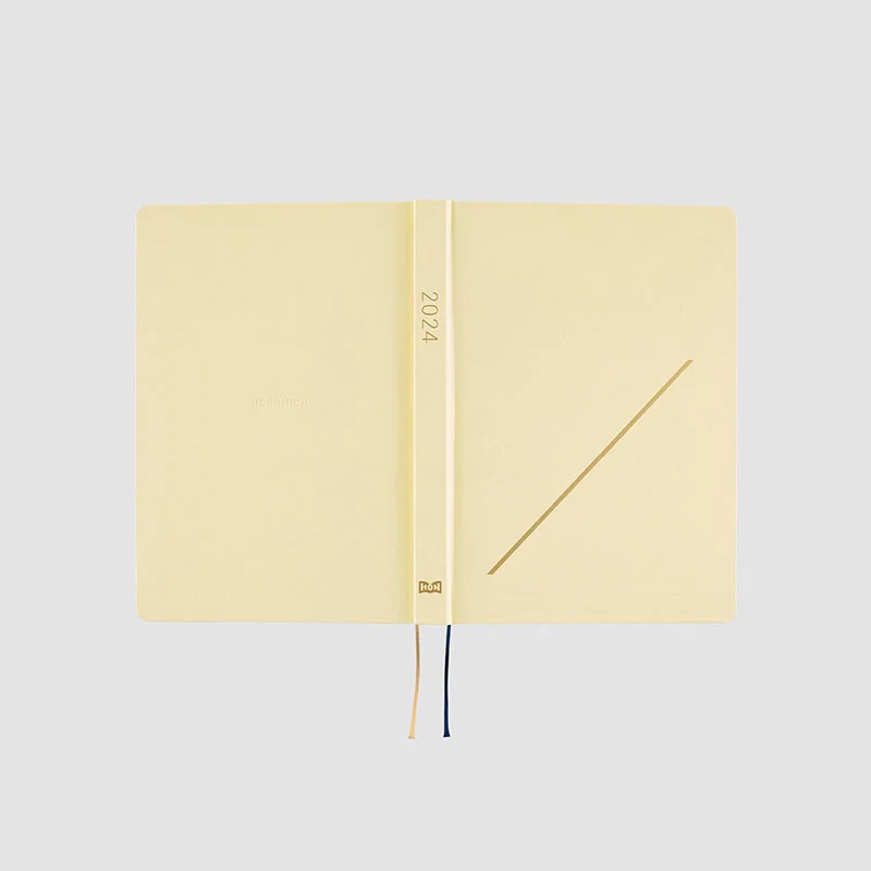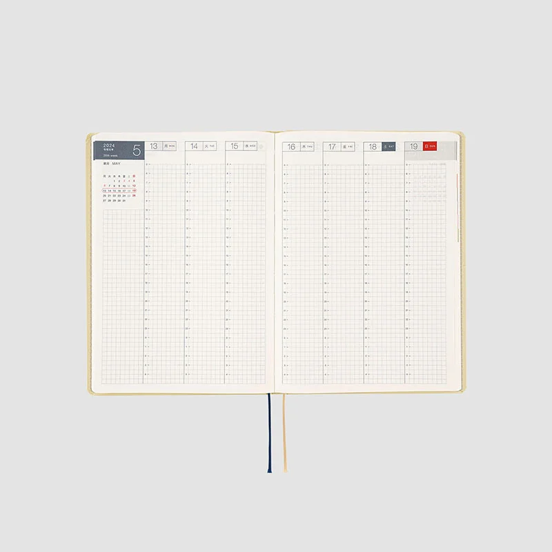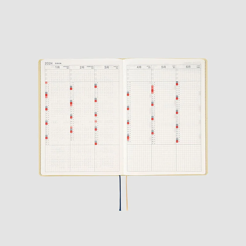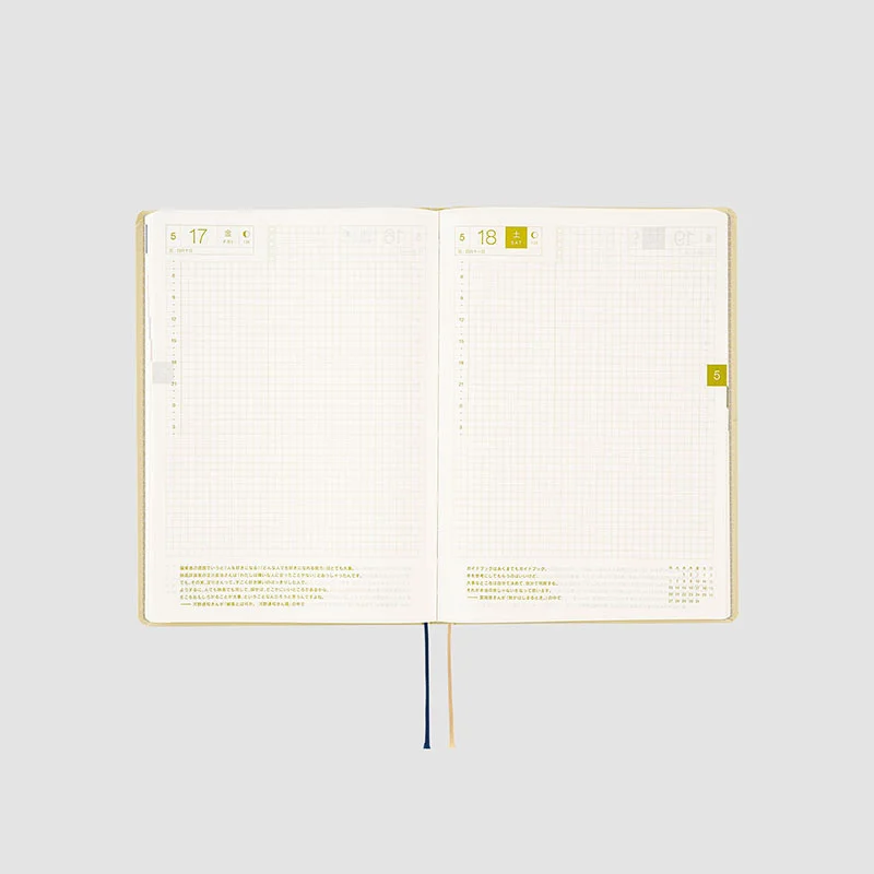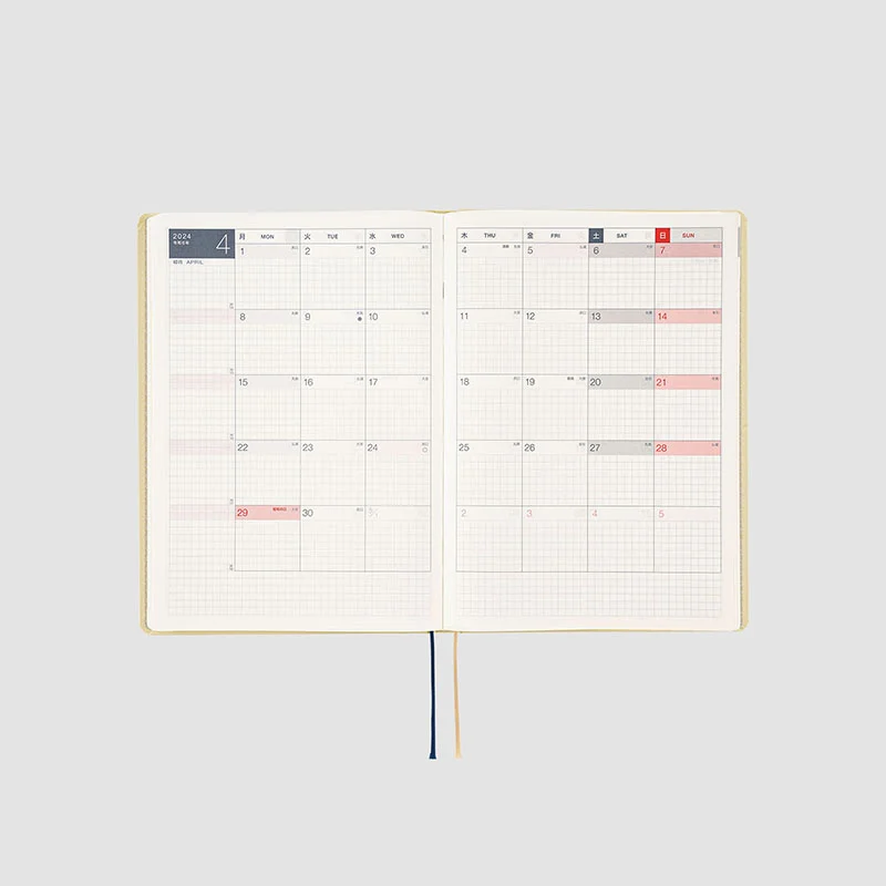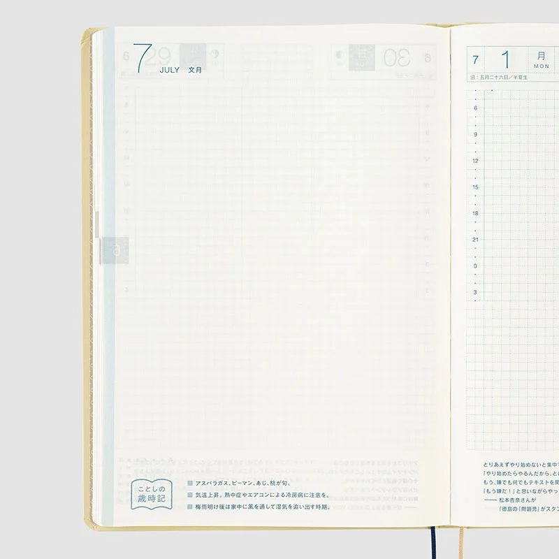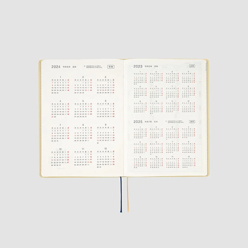 The Hobonichi Techo HON has a hardcover design already attached to the book. It’s designed to make you feel like you’re carrying around a favorite book, which you can pull out at any time to make notes no matter where you are. The book has A5 size pages with plenty of space to write and paste, and features a page per day, so the contents are the same as the Hobonichi Techo Cousin.