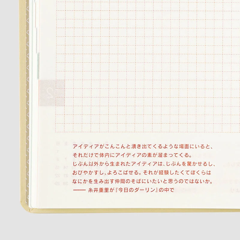 | Bonus Pages | Time Table / Graph Paper / Favorites / My 100 / An Interview with Myself / Seasonal Sweets to Make at Home / Caring for Your Eyes / Words to Remember / 365 Days Check-Off Sheet / Getting the Most Out of Your Hobonichi Techo / Gifts / Addresses / Personal Notes |