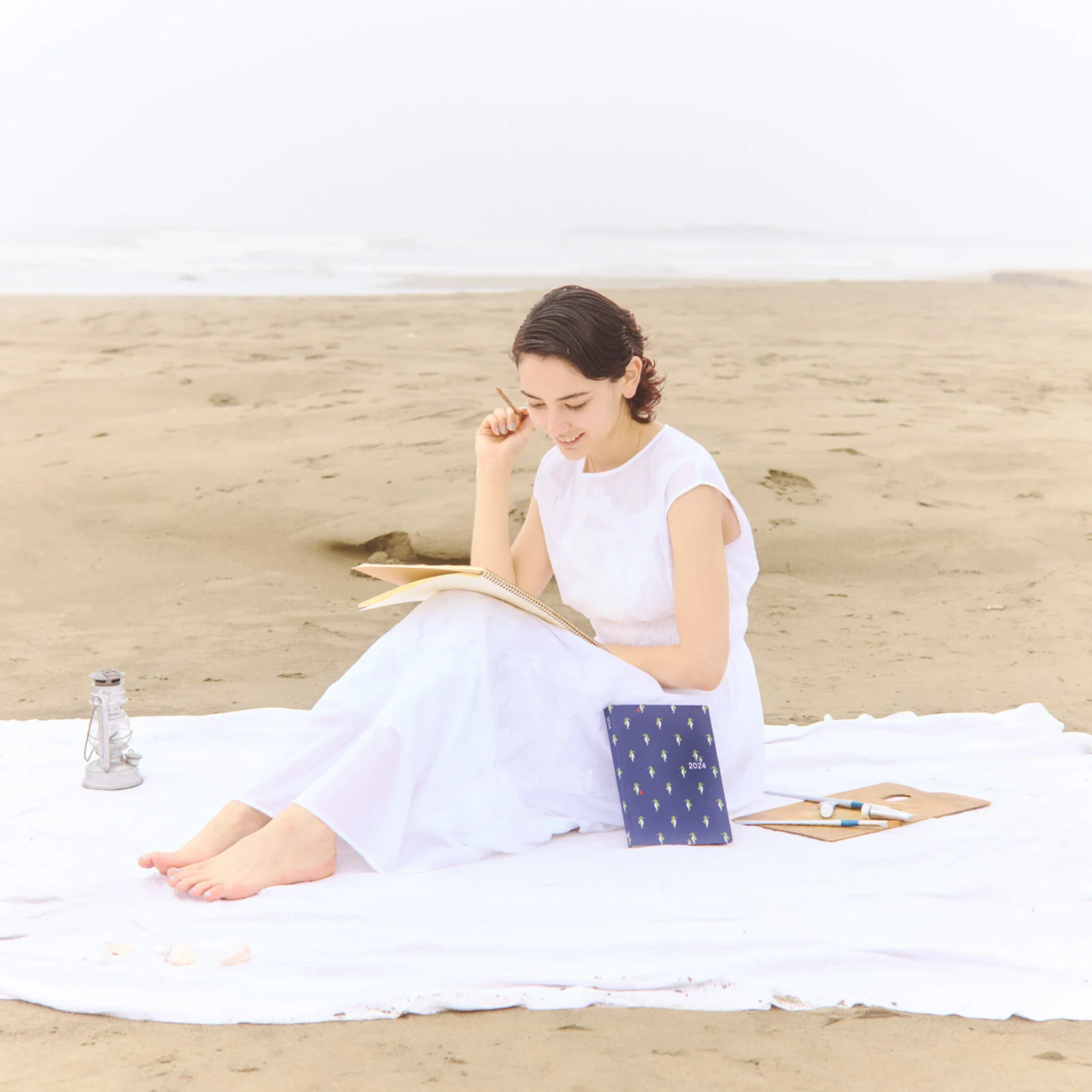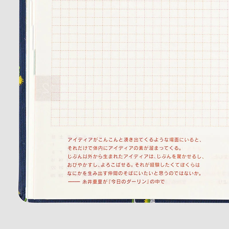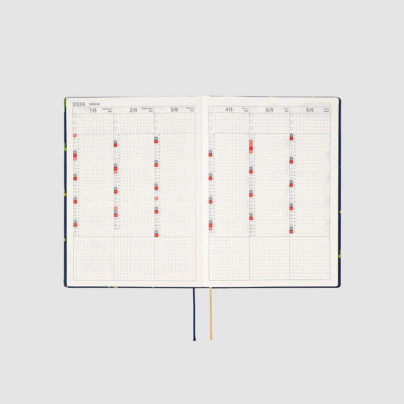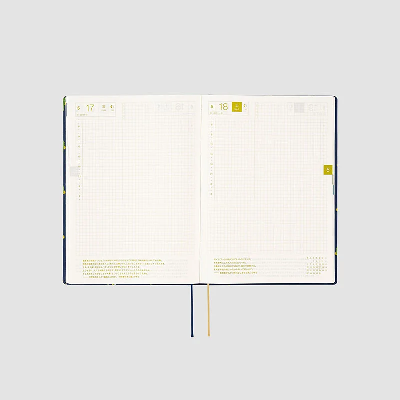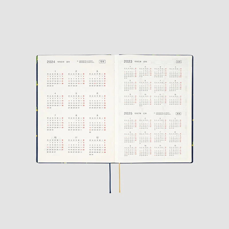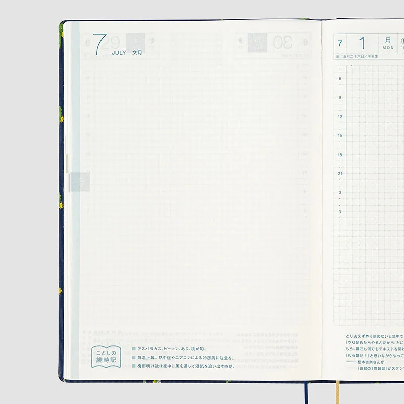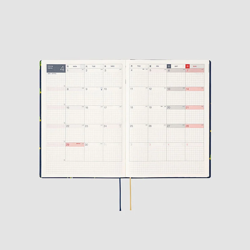 The Hobonichi Techo HON has a hardcover design already attached to the book. It’s designed to make you feel like you’re carrying around a favorite book, which you can pull out at any time to make notes no matter where you are. The book has A5 size pages with plenty of space to write and paste, and features a page per day, so the contents are the same as the Hobonichi Techo Cousin.