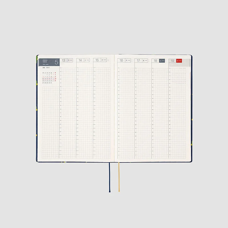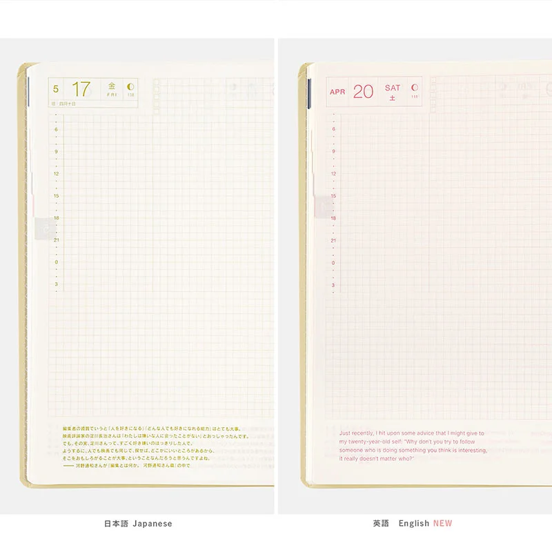 The contents are the same as the Hobonichi Techo Cousin book. The HON A5 size includes weekly pages which track a week in each two-page spread for easy planning and contain a handy time schedule.