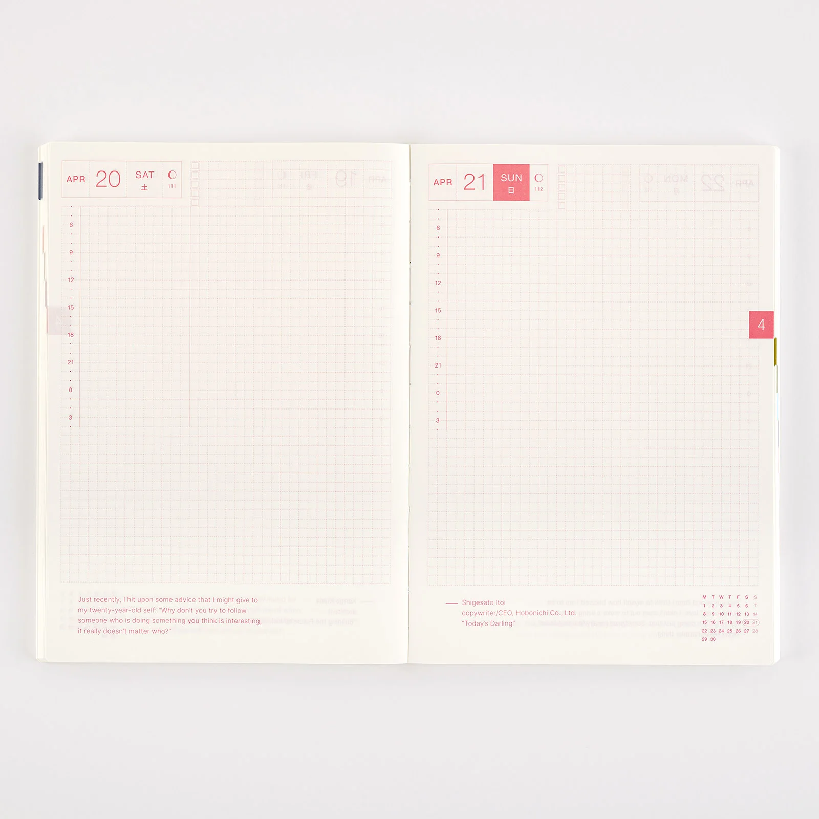 The daily pages include a quote per two-page spread specially chosen from its parent site, the Japanese web magazine Hobo Nikkan Itoi Shinbun.