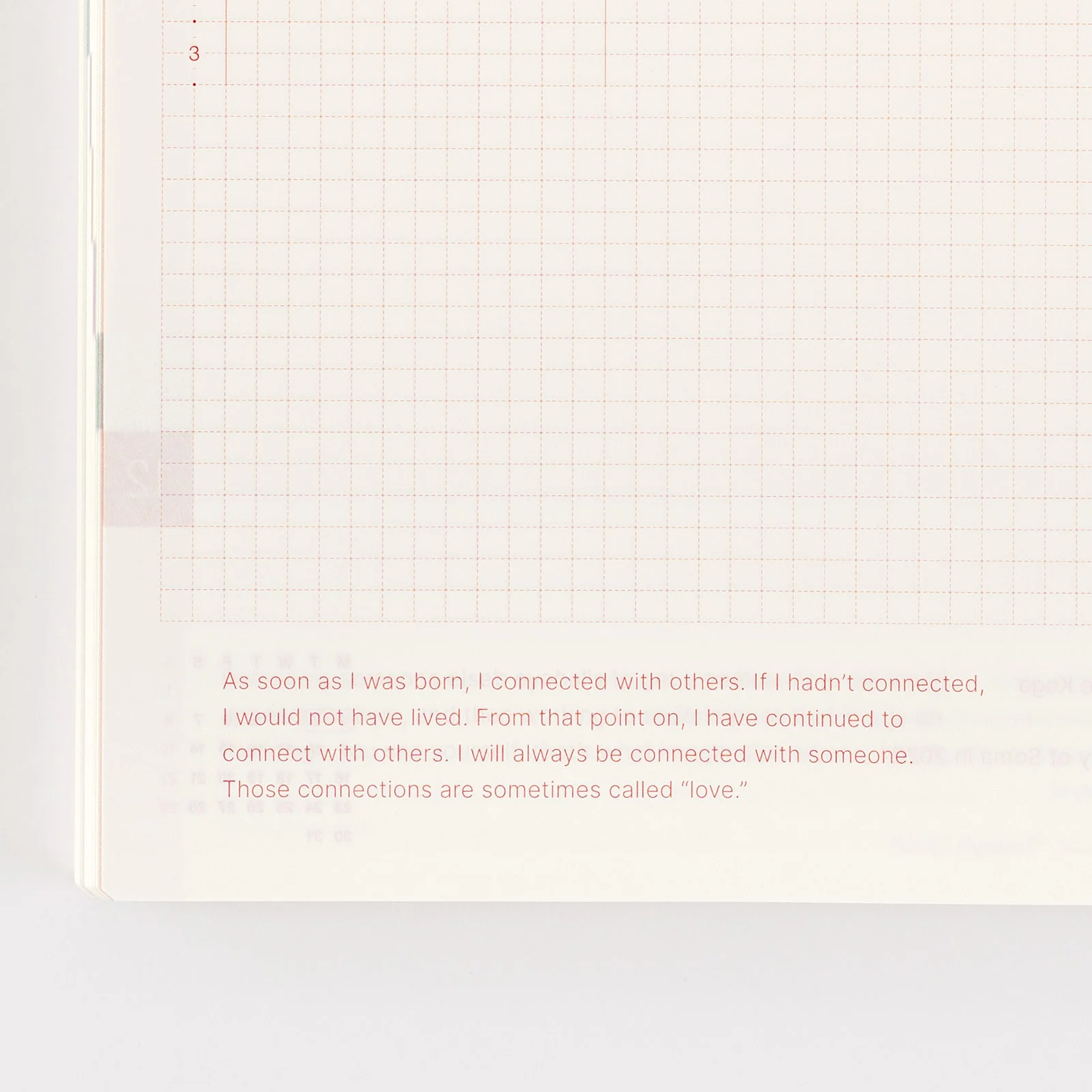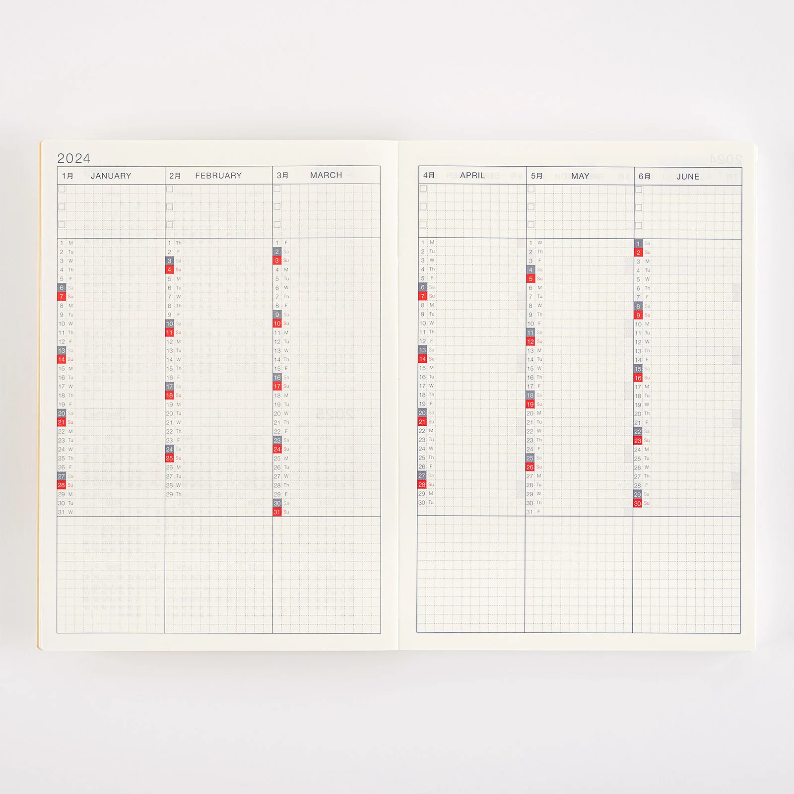 After years of testing, the graph paper has been set to 3.7 mm for optimal writing comfort. The graph paper design allows users to write from any starting point on the page, and the lines have been printed in light colors so users can either customize it to their own layout or ignore it completely. Like with the Japanese version, each month is printed in a different color.