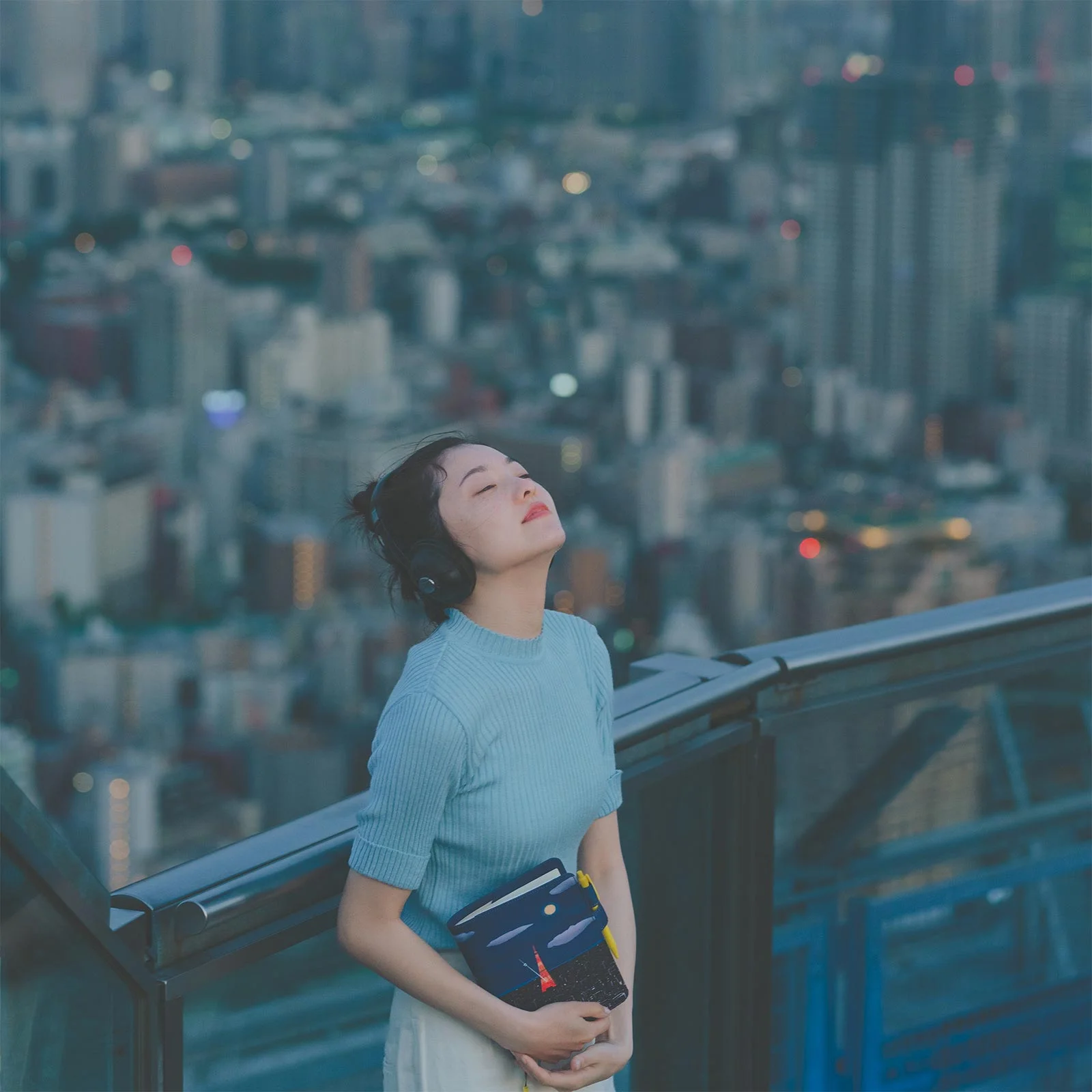 The full moon fills the night sky. Tokyo Tower sparkles underneath the light of the moon as it stands with a metronome needle attached. The lights from surrounding buildings encircle the rhythmic tower, and in the distance is a bright blue line along the horizon. Could that be the sea?