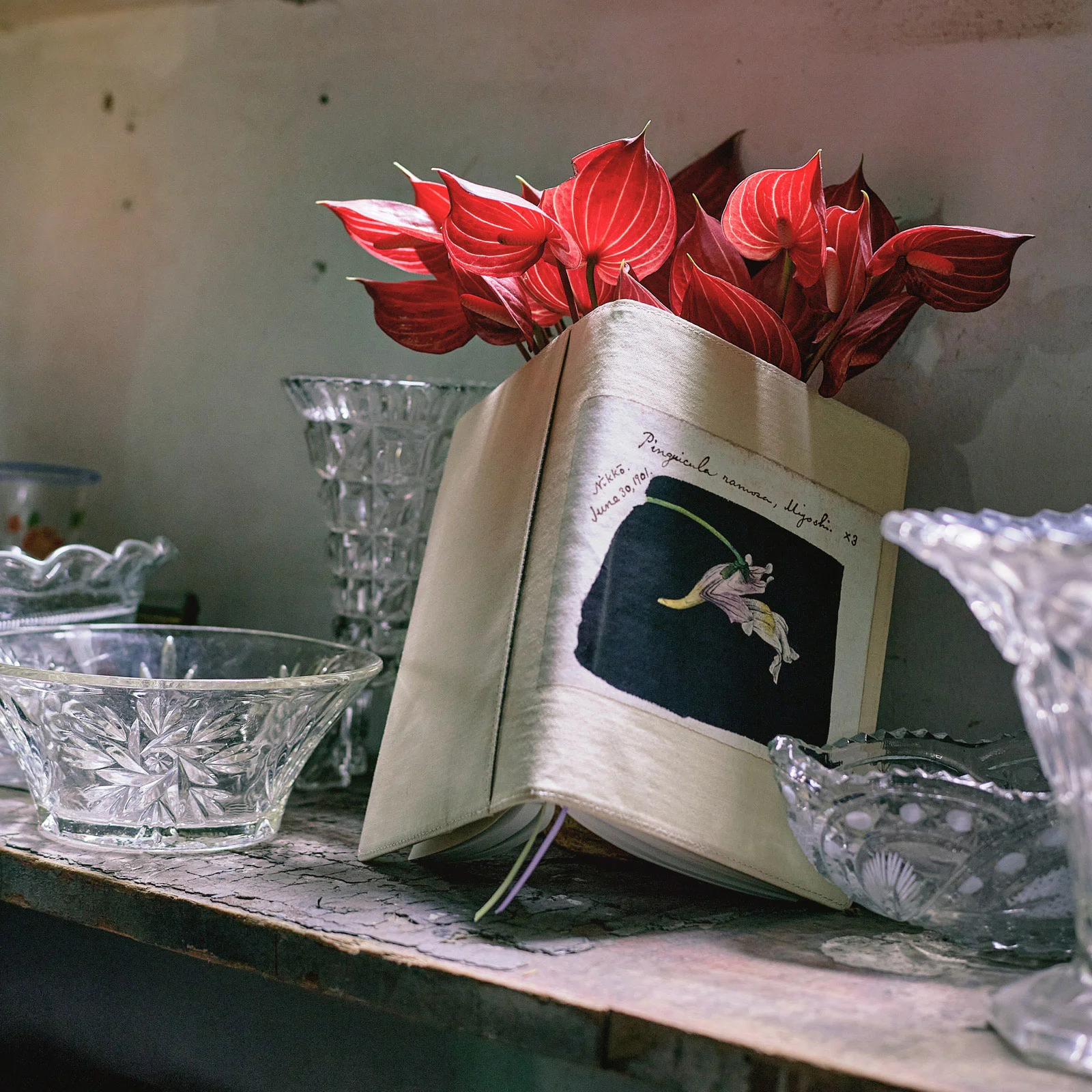 For the A5 size cover, a lovely blooming Koshinso flower is ink-jet printed on ecru-colored cotton fabric. The matte texture is applied even to the edges of the original drawing, reflecting the atmosphere of the botanical illustrations drawn by Dr. Makino.