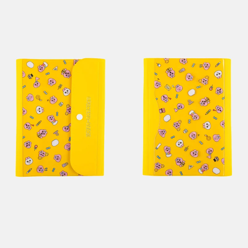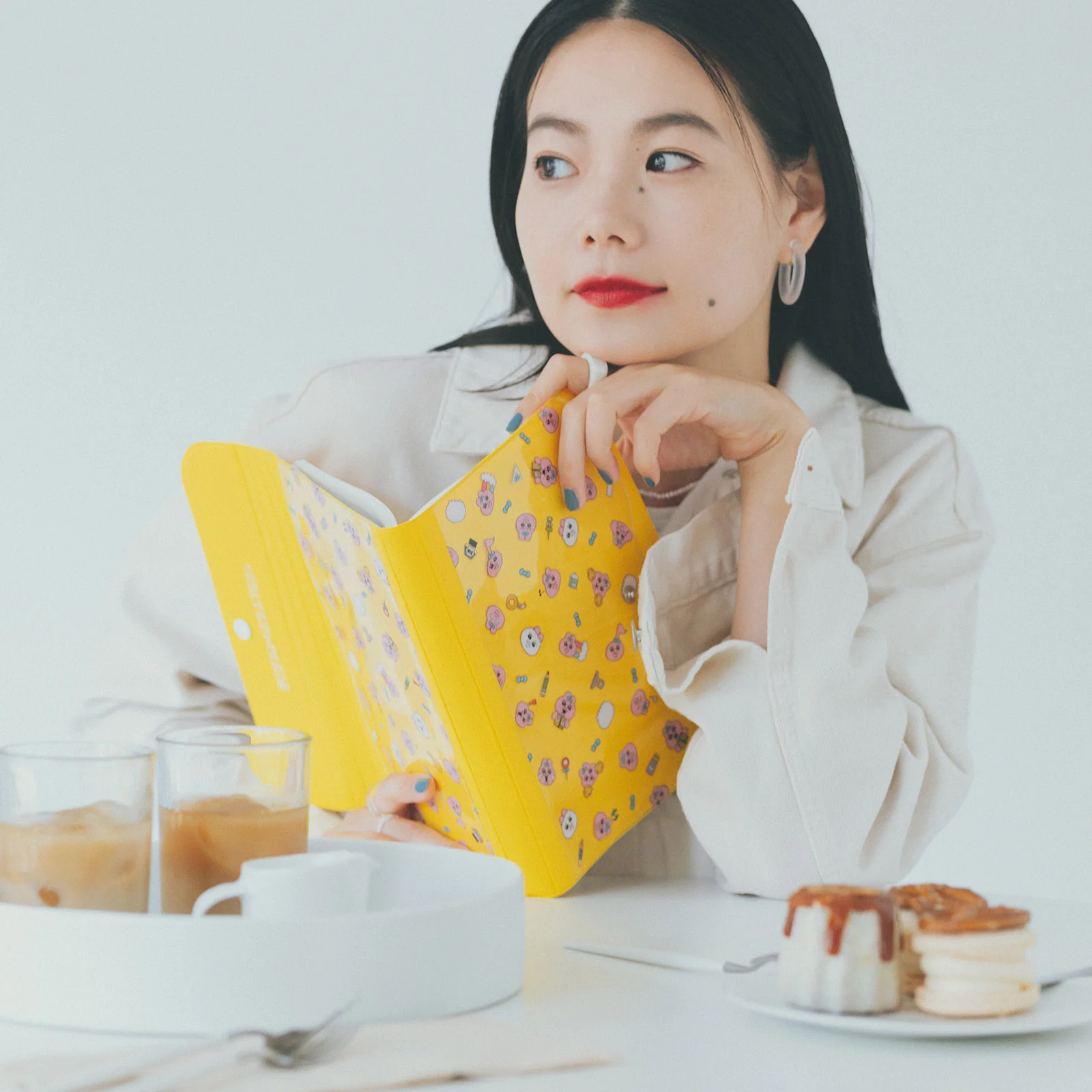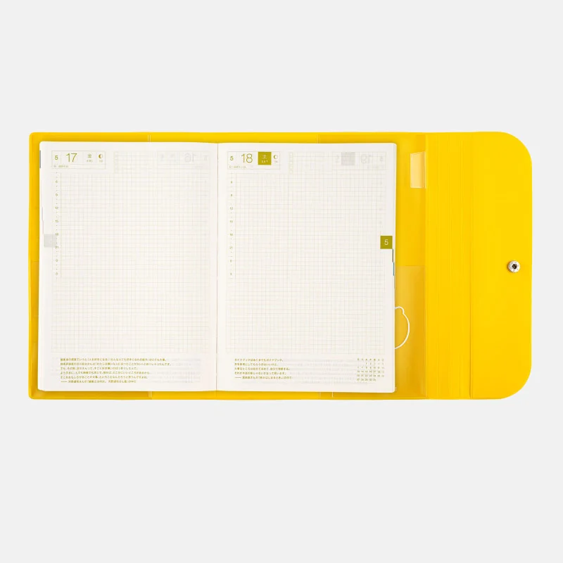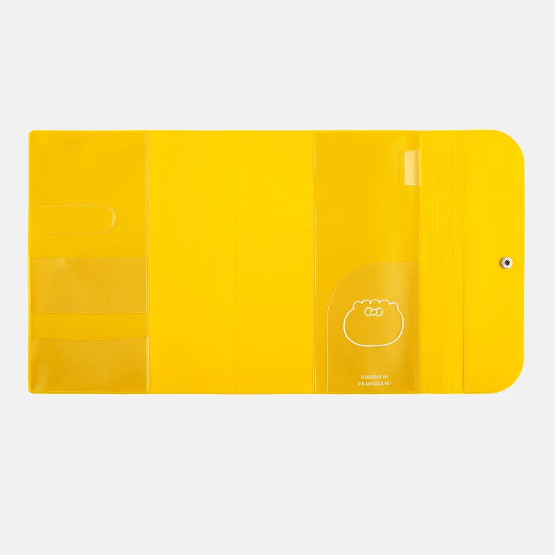 “Opanchu Usagi (Stationery)” is a bright yellow techo cover that cheers you up just by the look of it. You can find Opanchu Usagi in various styles with illustrations of pencils, erasers, paper clips, and other stationery items unique to Hobonichi Techo. The trifold design snaps shut with a button. The Hobonichi logo is foil-pressed in silver on the flap.