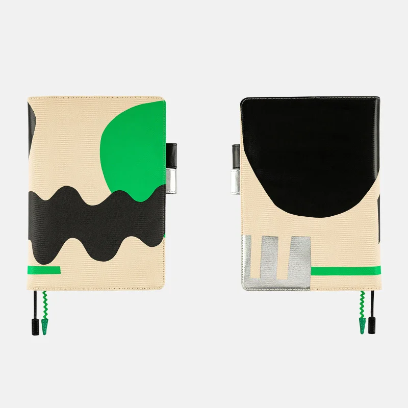 The cover’s cream-colored cotton material is given a pop-art look with green, black, and silver shapes drawn organically around the design. The green and matte black sections are silkscreen printed, while the silver and shiny black sections are foil-printed, giving the cover an elaborate design.