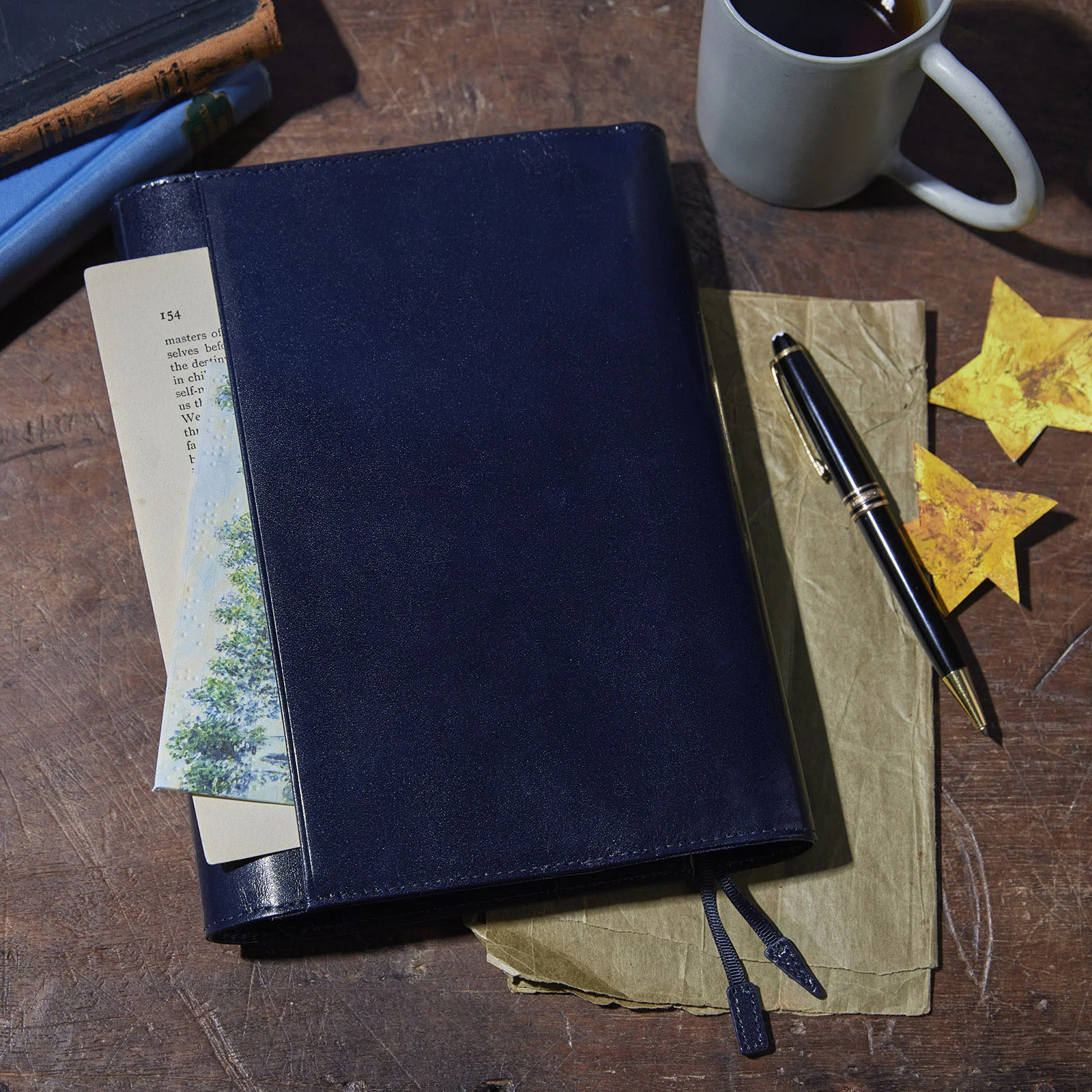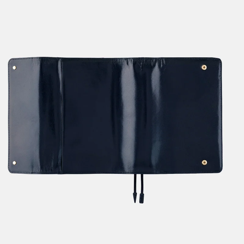 This trifold cover is made of deep navy leather reminiscent of a quiet night sky.