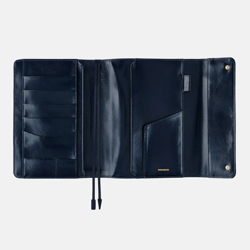 The Hobonichi logo is foil-pressed in gold on the right-hand pocket.