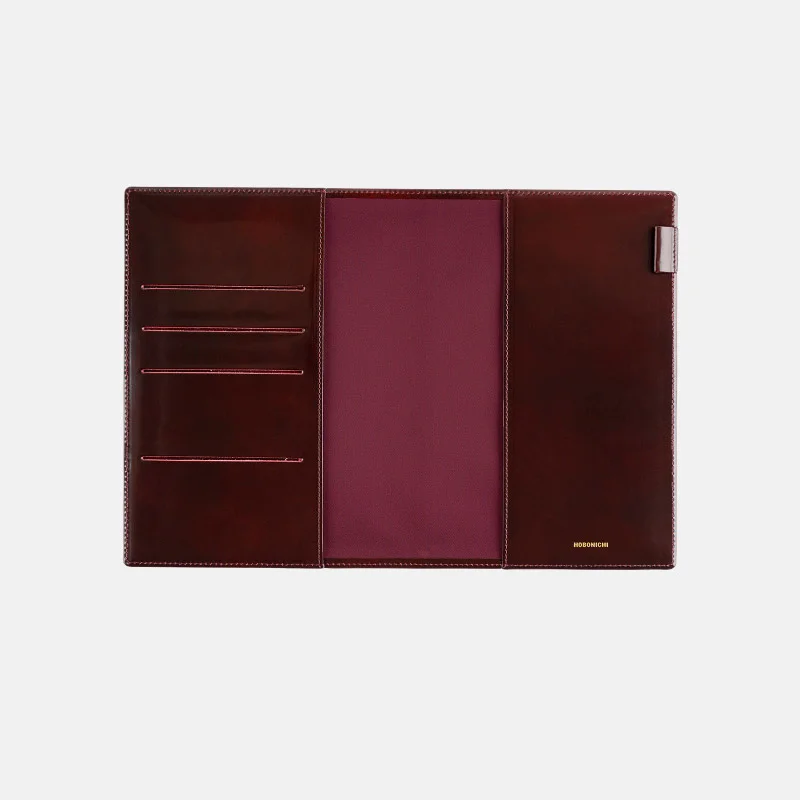 This leather design is specially designed to fit snugly around your Hobonichi Techo book while keeping it slim and comfortably portable. It does not contain butterfly stopper pen holders, and pockets are kept to a bare minimum.