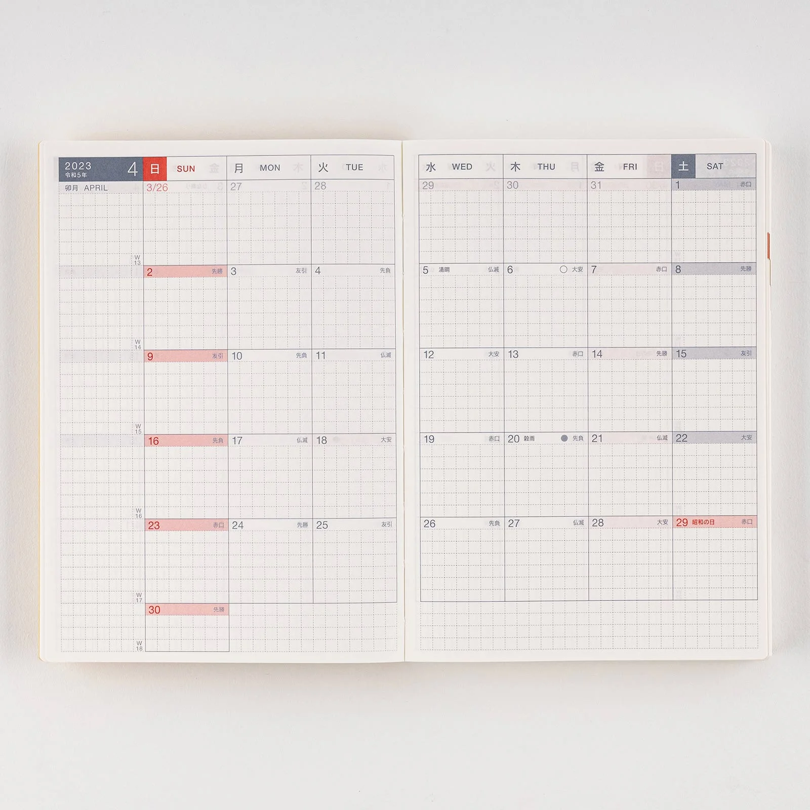 This original form of the Hobonichi Techo has been loved by many users since its introduction in 2002, and the 2023 edition marks the techo’s 22nd year. Its daily pages offer plenty of space to fill despite the book’s compact A6 size. The graph paper offers an open layout for you to neatly lay out writings, clippings, and drawings. This is the April-start version and covers April 2023 up to March 2024.