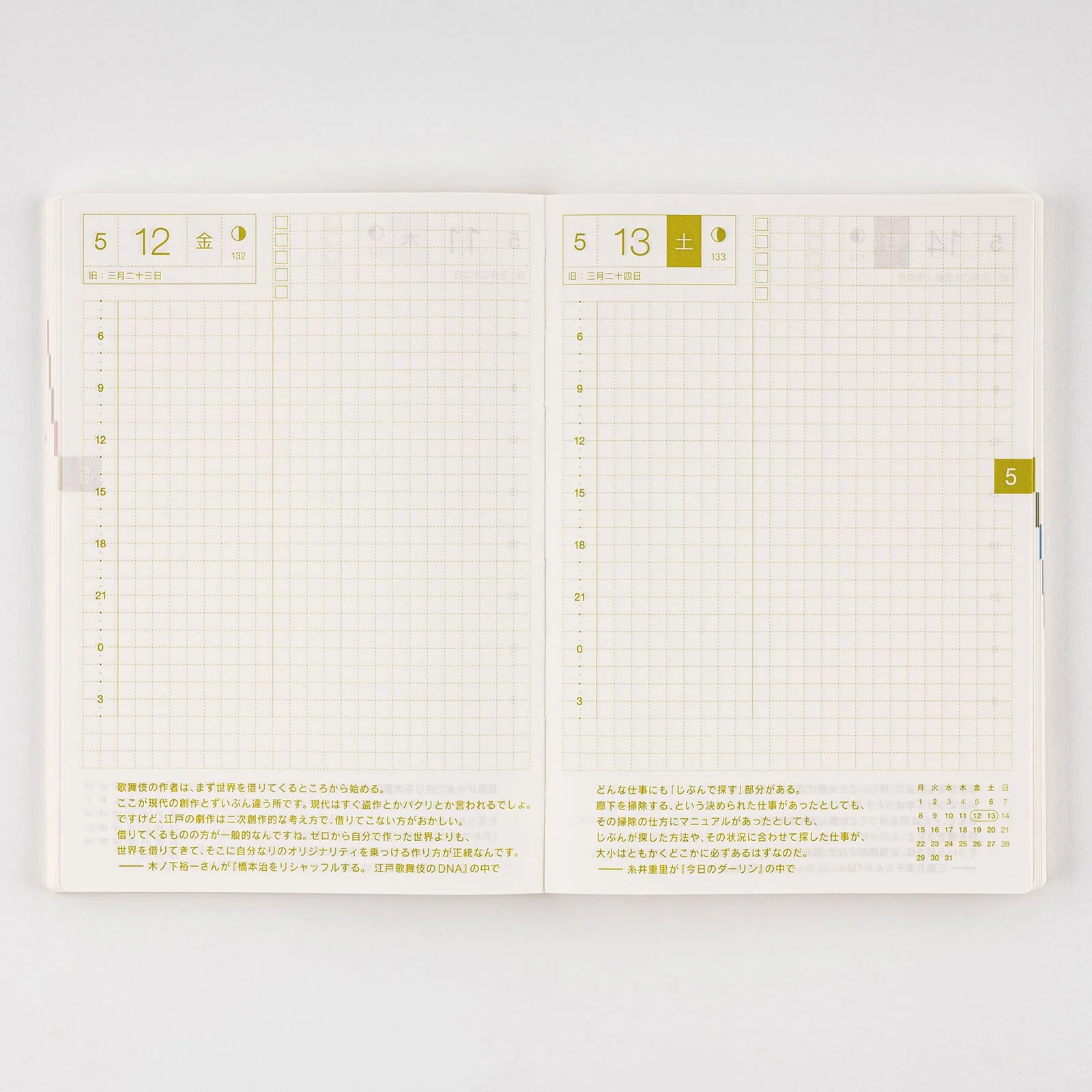 The Hobonichi Techo includes quotes specially chosen from its parent site, the Japanese web magazine Hobo Nikkan Itoi Shinbun. Each daily page has a quote in Japanese.