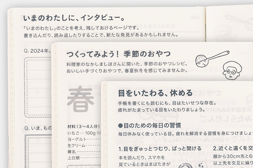 Other than the daily pages with lots of space to write, the book contains several sections that are great for schedule management, such as a yearly calendar, monthly calendar, and yearly index page. The back of the book has bonus pages, including An Interview with Myself, Seasonal Sweets to Make at Home, and Caring for Your Eyes.