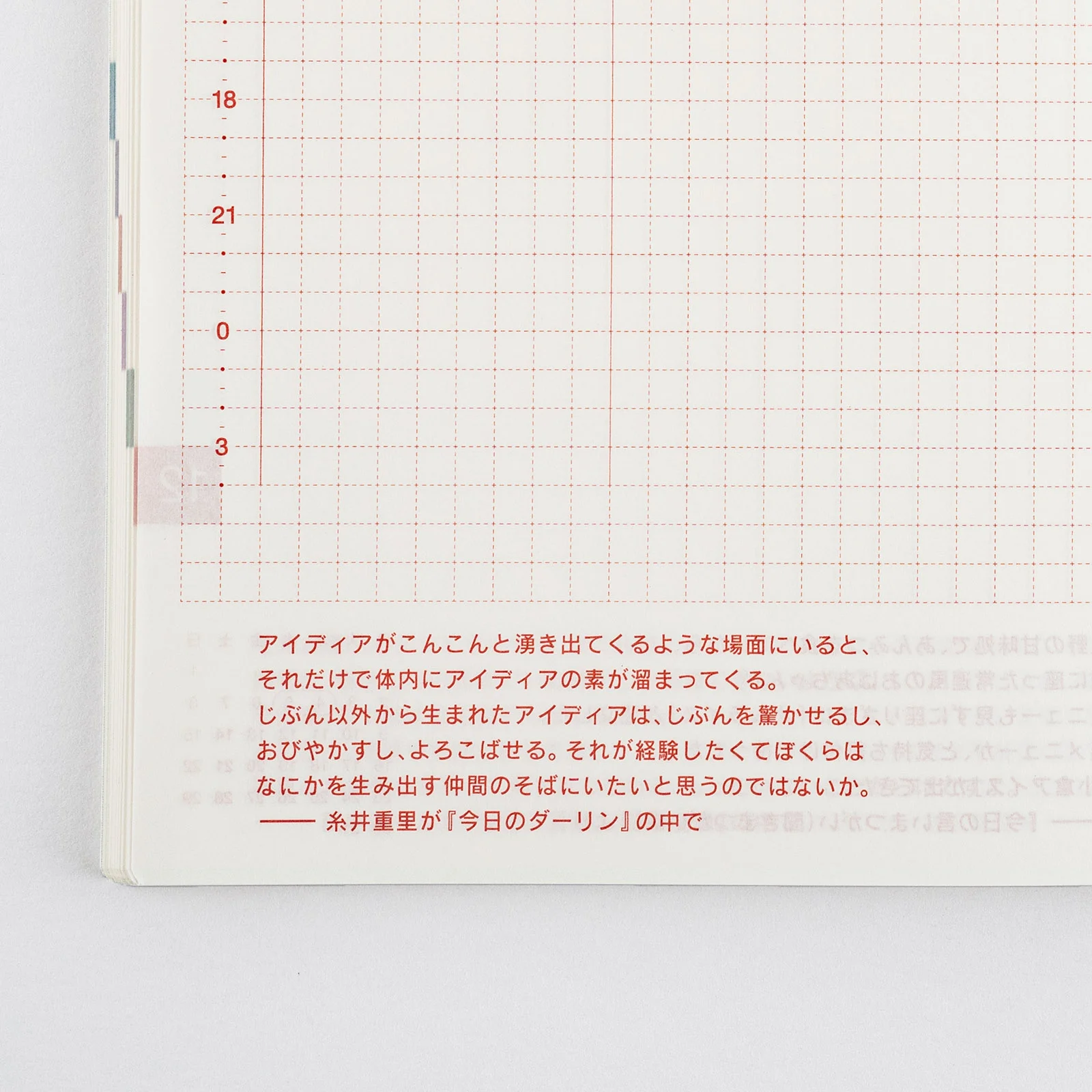 | Bonus Pages | Time Table / Graph Paper / Favorites / My 100 / An Interview with Myself / Seasonal Sweets to Make at Home / Caring for Your Eyes / Solar Terms / Emergency Preparedness / Conversion Chart / Getting the most of Hobonichi / Gifts / Age Table / Addresses (for 6 people) / Personal Notes |