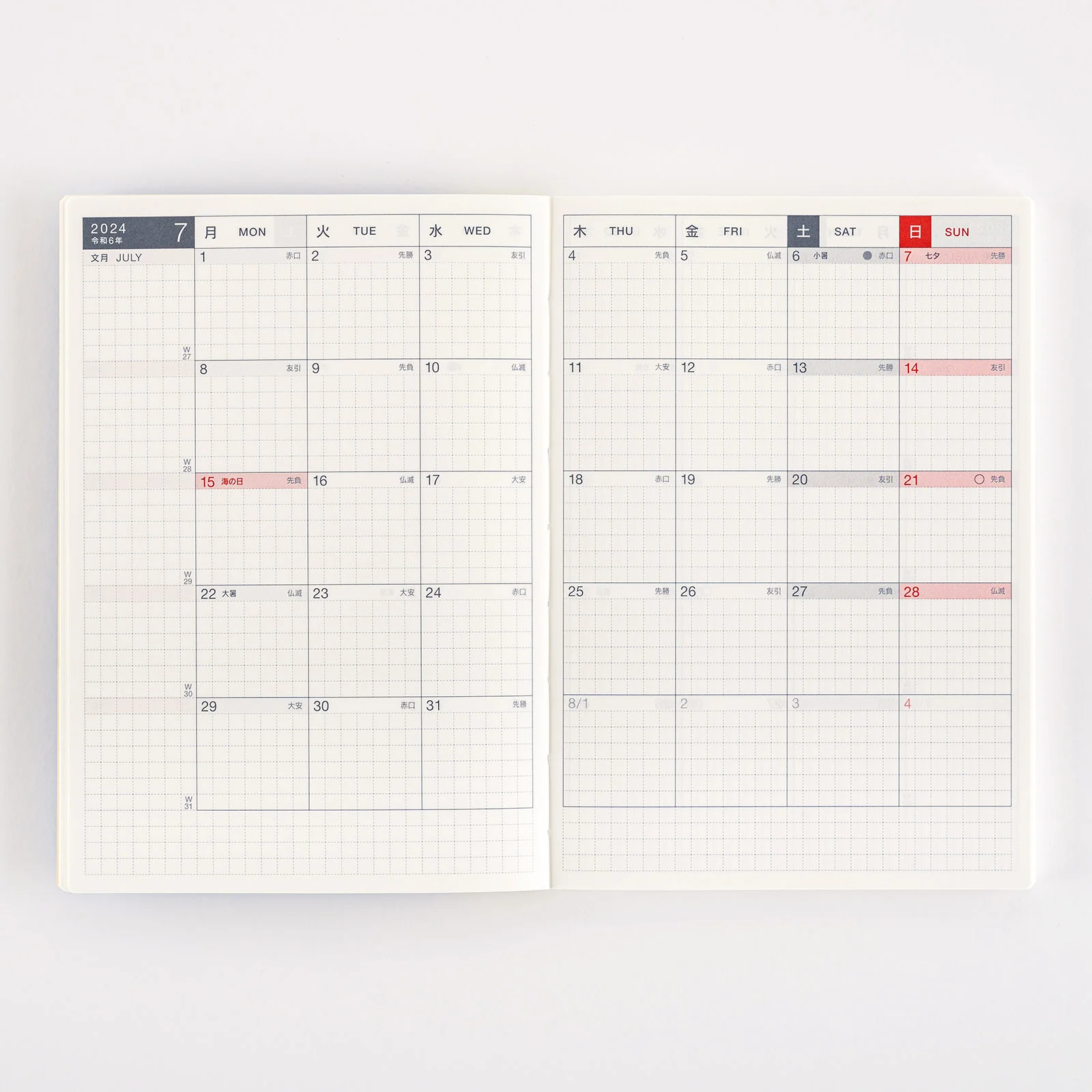 The Day-Free Original Size is an A6 size monthly techo that is split into two main parts: monthly calendars and a graph-paper notebook. The book fits nicely into covers designed for the standard Hobonichi Techo Original.
