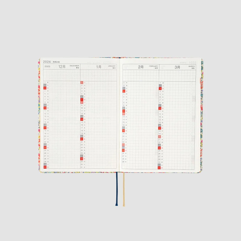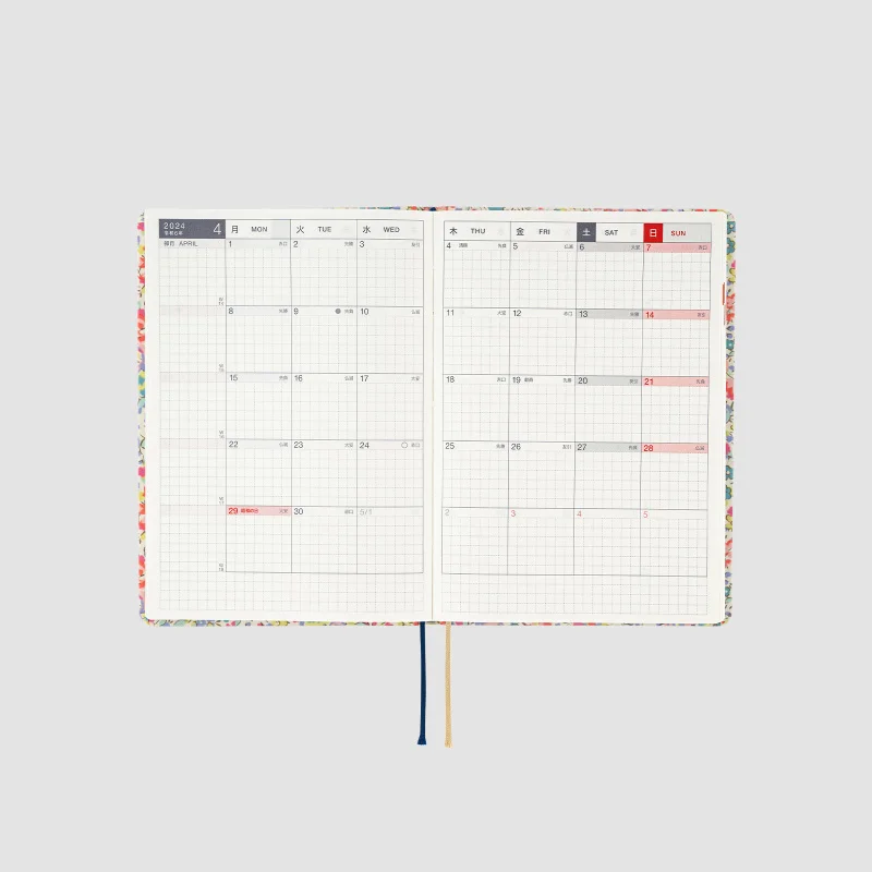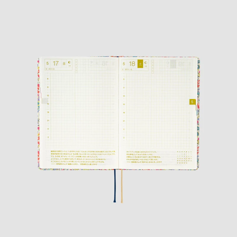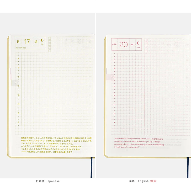 The Hobonichi Techo HON has a hardcover design already attached to the book. It’s designed to make you feel like you’re carrying around a favorite book, which you can pull out at any time to make notes no matter where you are. The book has A6 size pages and features a page per day, so the contents are the same as the Hobonichi Techo Original.