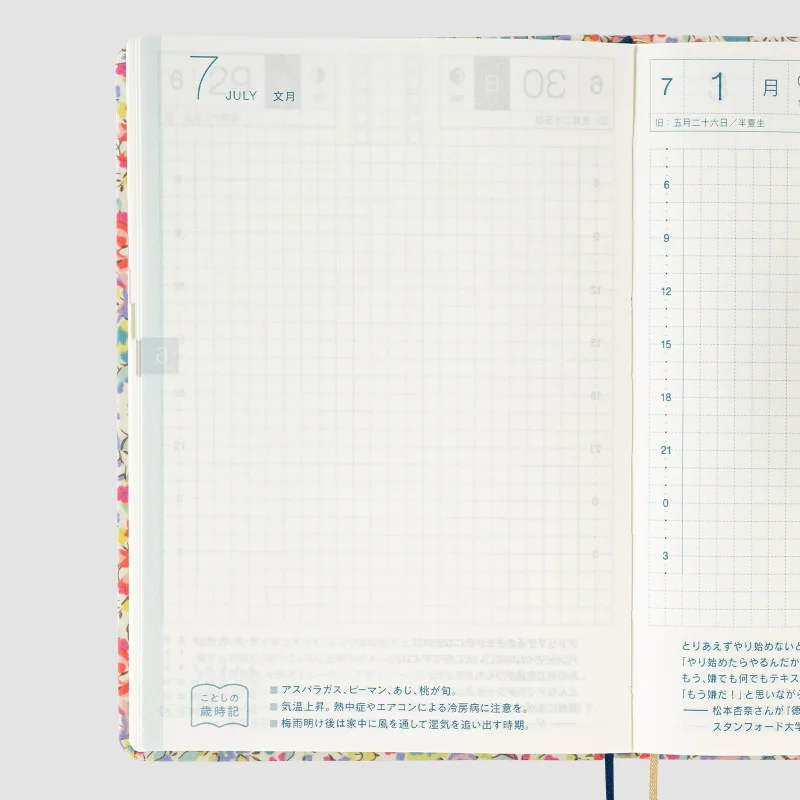 | Bonus Pages | Time Table / Graph Paper / Favorites / My 100 / An Interview with Myself / Seasonal Sweets to Make at Home / Caring for Your Eyes / Solar Terms / Emergency Preparedness / Conversion Chart / Getting the most of Hobonichi / Gifts / Age Table / Addresses (for 6 people) / Personal Notes |