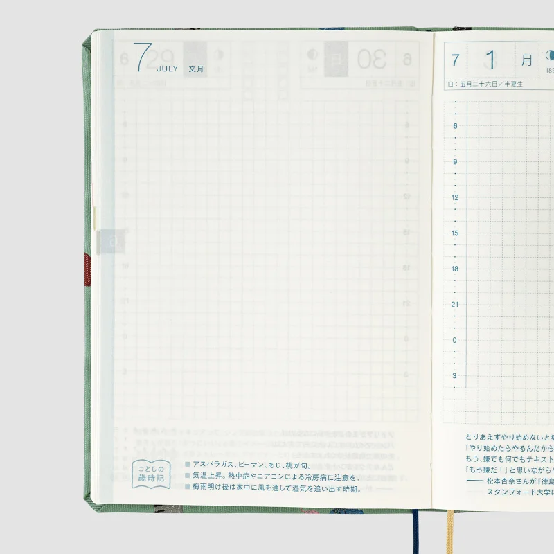 | Bonus Pages | Time Table / Graph Paper / Favorites / My 100 / An Interview with Myself / Seasonal Sweets to Make at Home / Caring for Your Eyes / Solar Terms / Emergency Preparedness / Conversion Chart / Getting the most of Hobonichi / Gifts / Age Table / Addresses (for 6 people) / Personal Notes |