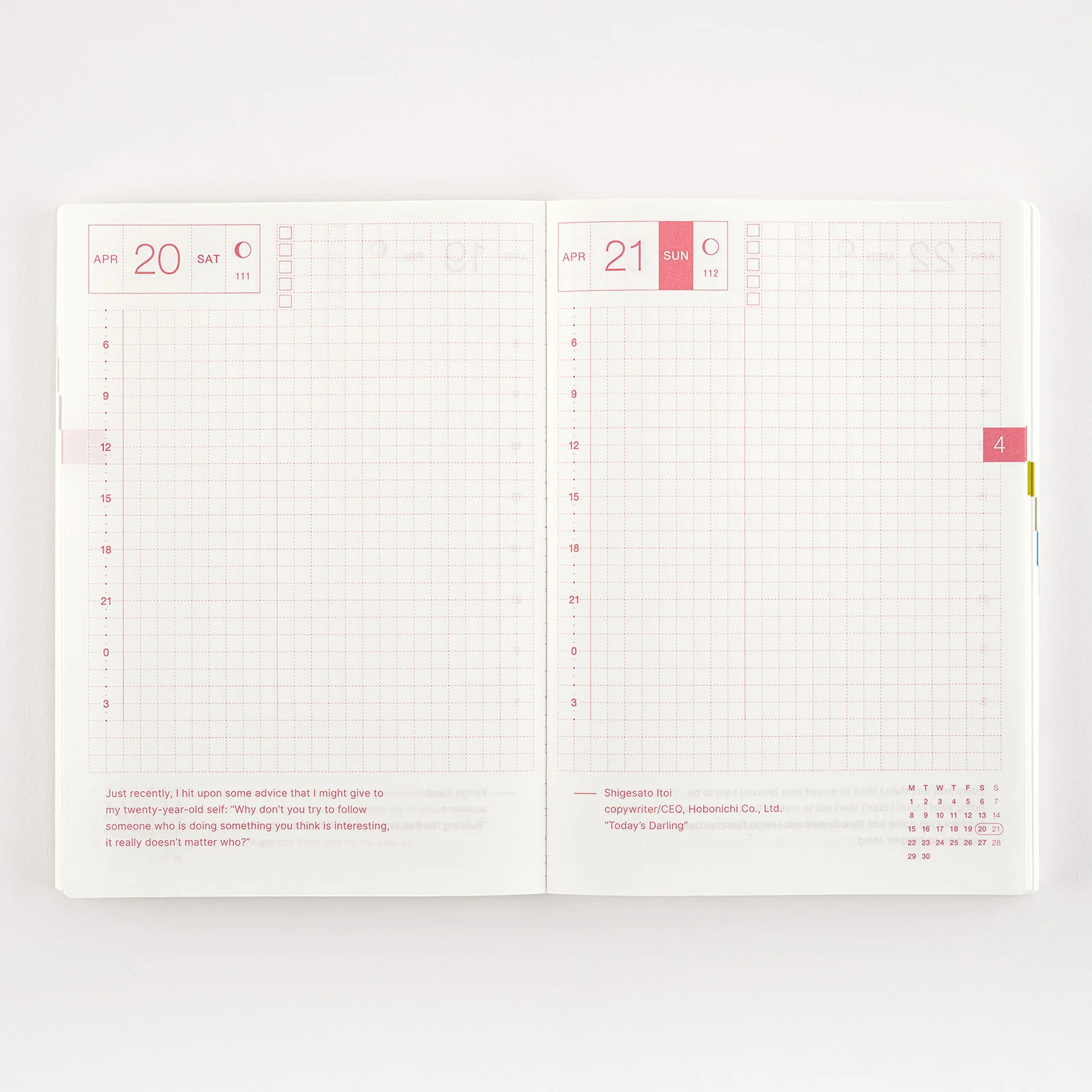 The daily pages include a quote per two-page spread specially chosen from its parent site, the Japanese web magazine Hobo Nikkan Itoi Shinbun.