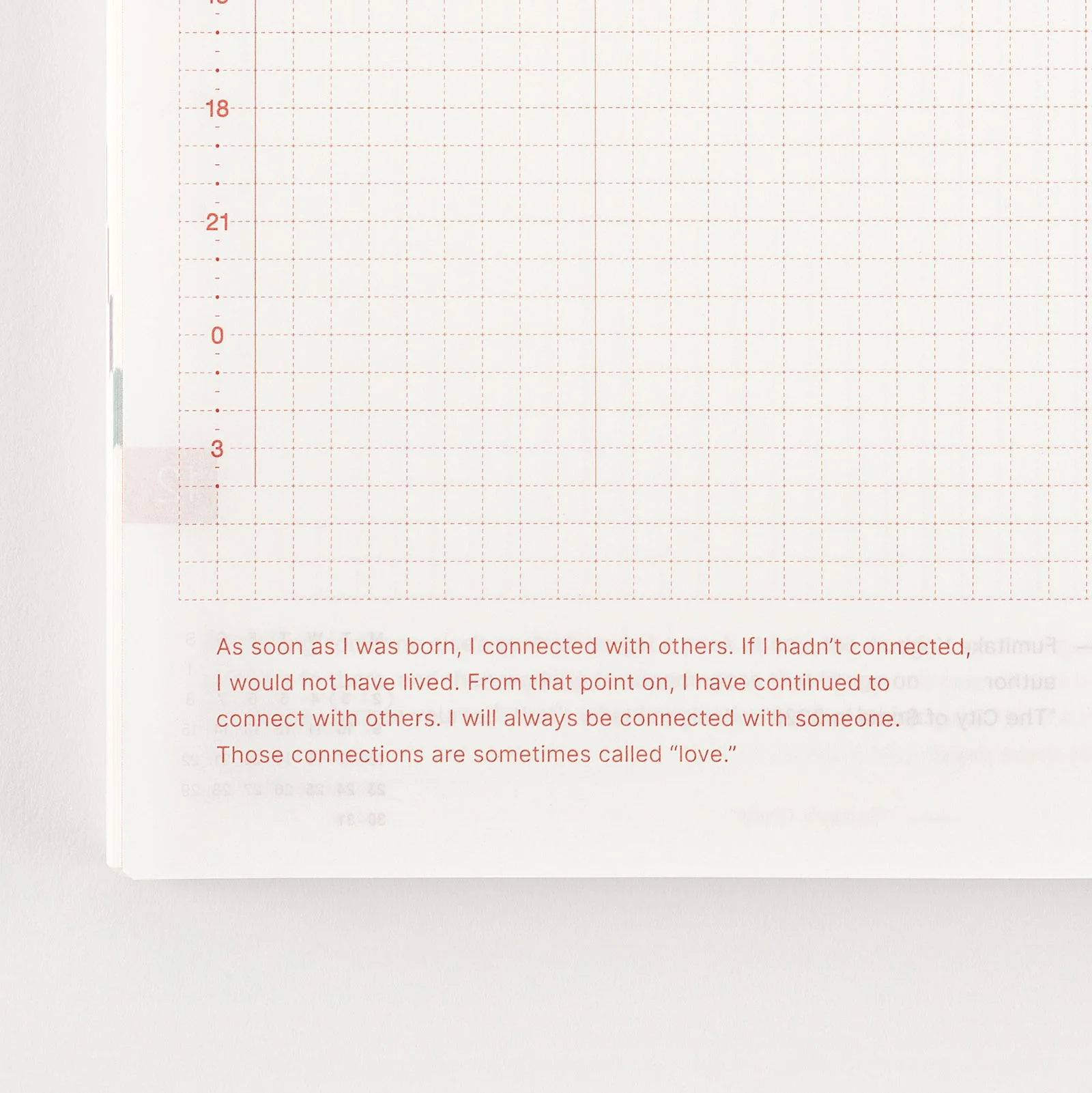 After years of testing, the graph paper has been set to 3.7 mm for optimal writing comfort. The graph paper design allows users to write from any starting point on the page, and the lines have been printed in light colors so users can either customize it to their own layout or ignore it completely. Like with the Japanese version, each month is printed in a different color.