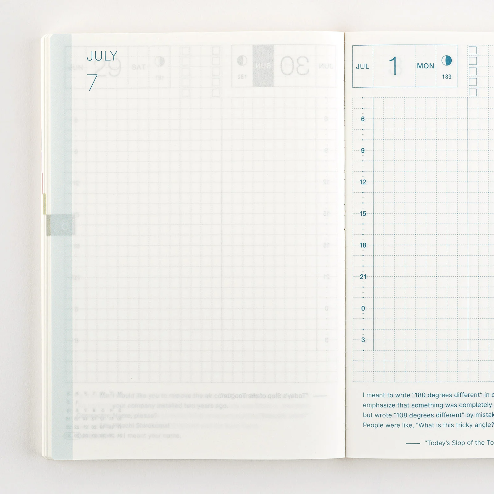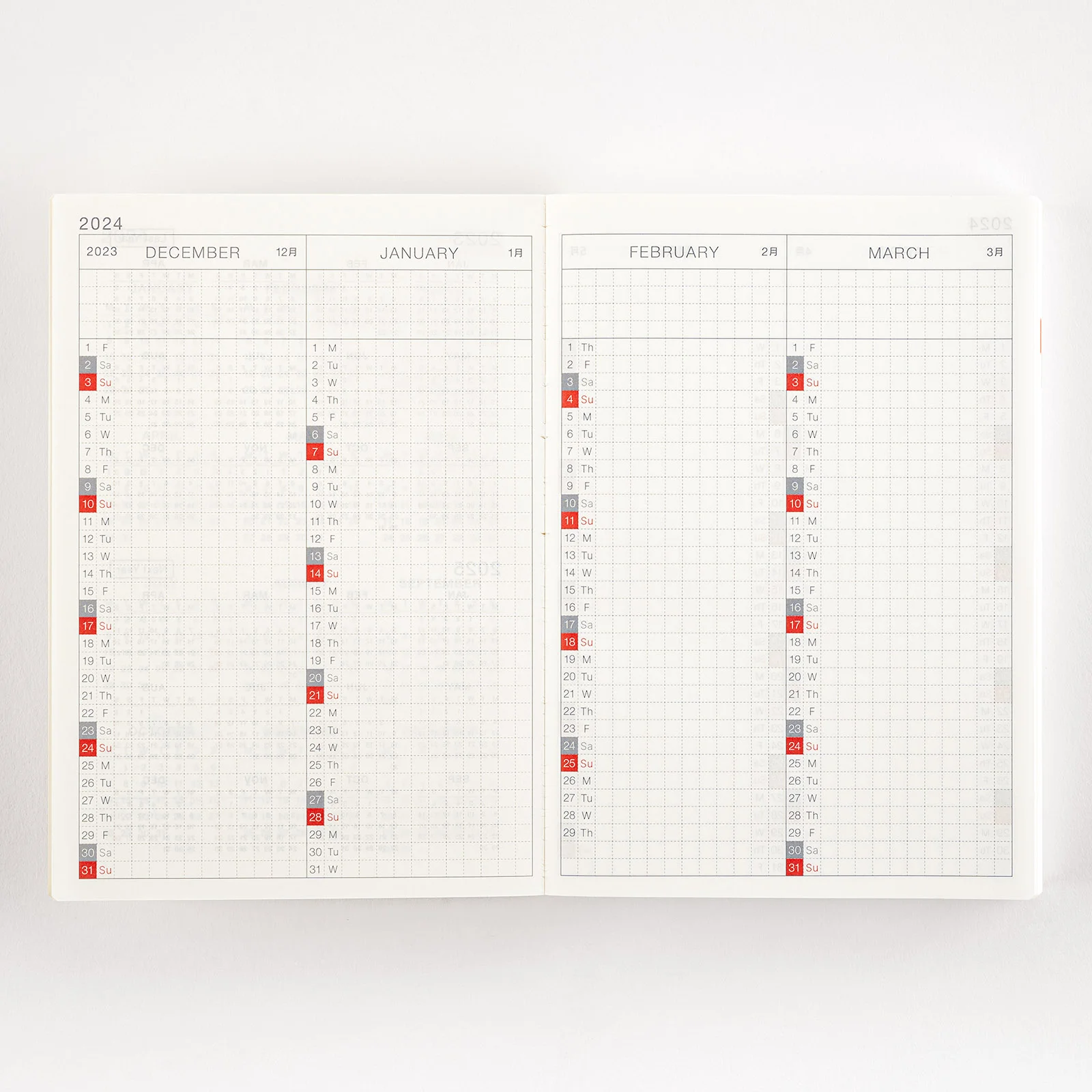 This original form of the Hobonichi Techo has been loved by many users since its introduction in 2002, and the 2024 edition marks the techo’s 23rd year. This techo has its elements written in English. Its daily pages offer plenty of space to fill despite the book’s compact A6 size. The graph paper offers an open layout for you to neatly lay out writings, clippings, and drawings.