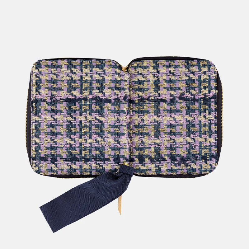 The zipper pull is accented with a wide navy grosgrain ribbon that allows you to hold the cover like a clutch bag.