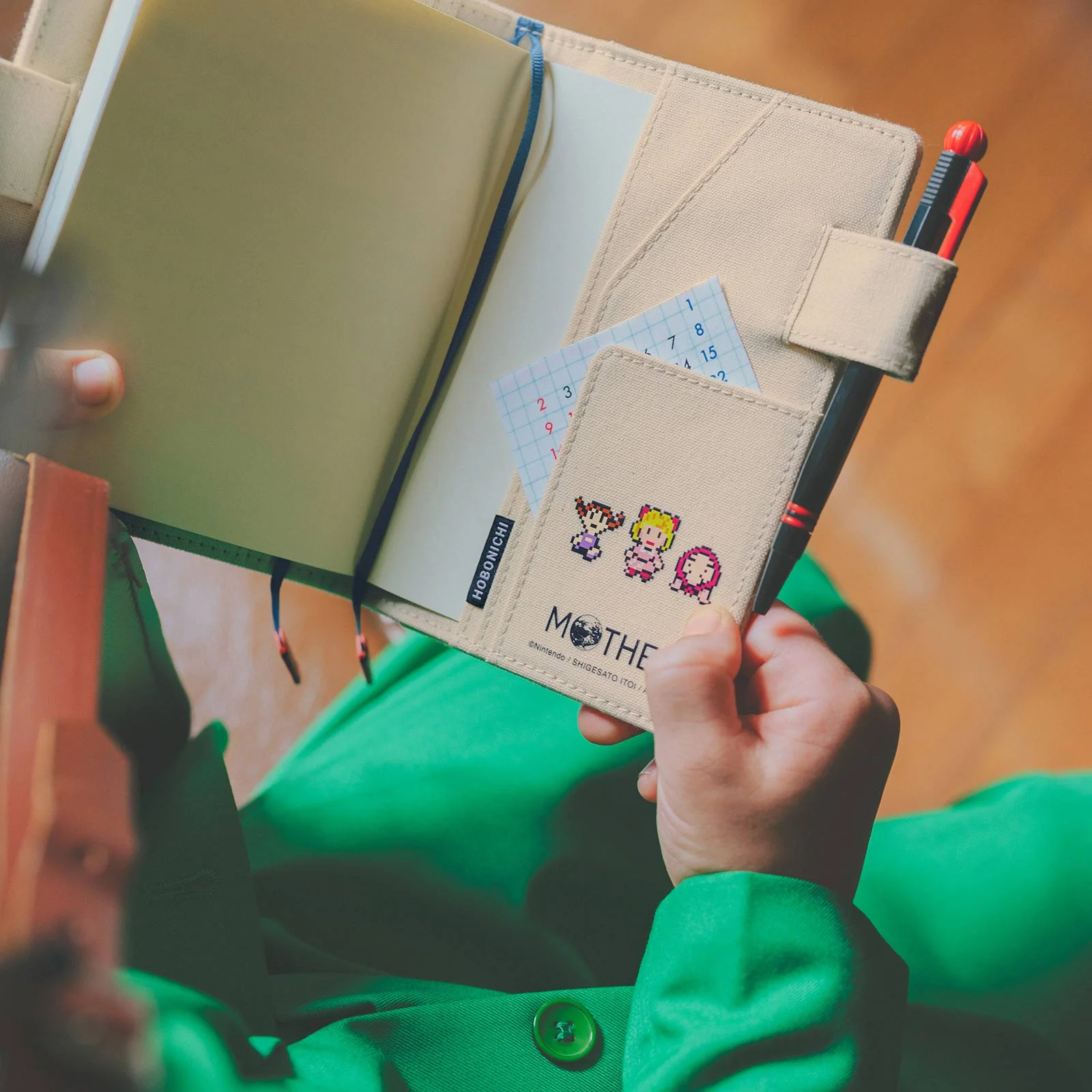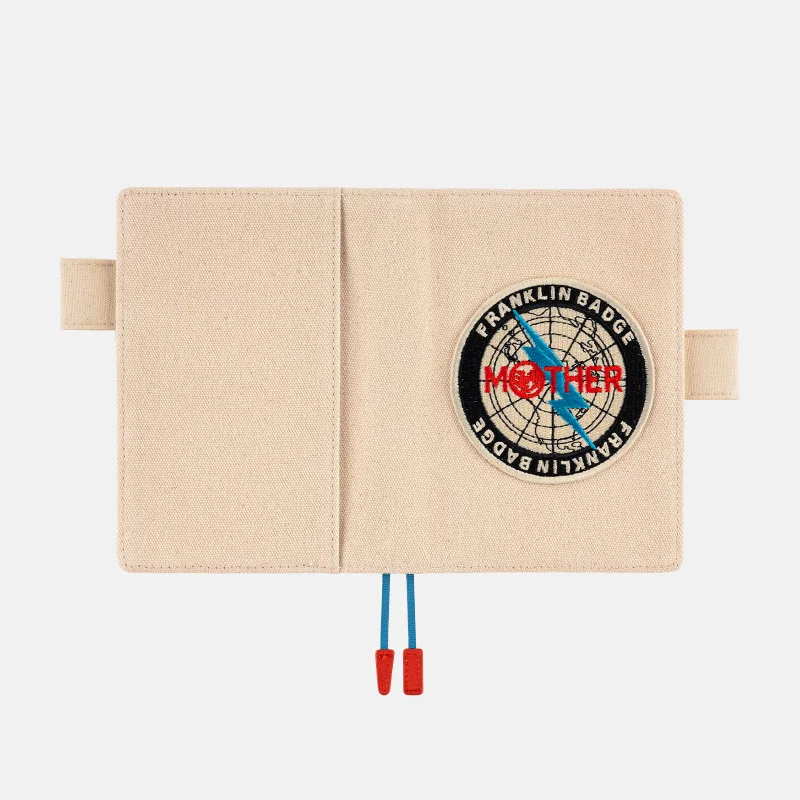 This cover design is based on Shigesato Itoi's 1994 Super Nintendo game, MOTHER 2 (EarthBound in North America). It’s made from a natural-colored canvas material adorned with an embroidered Franklin Badge patch that gives it a satisfying three-dimensional feel. If you tip the cover and view the patch at different angles, you’ll see the way its threads sparkle.