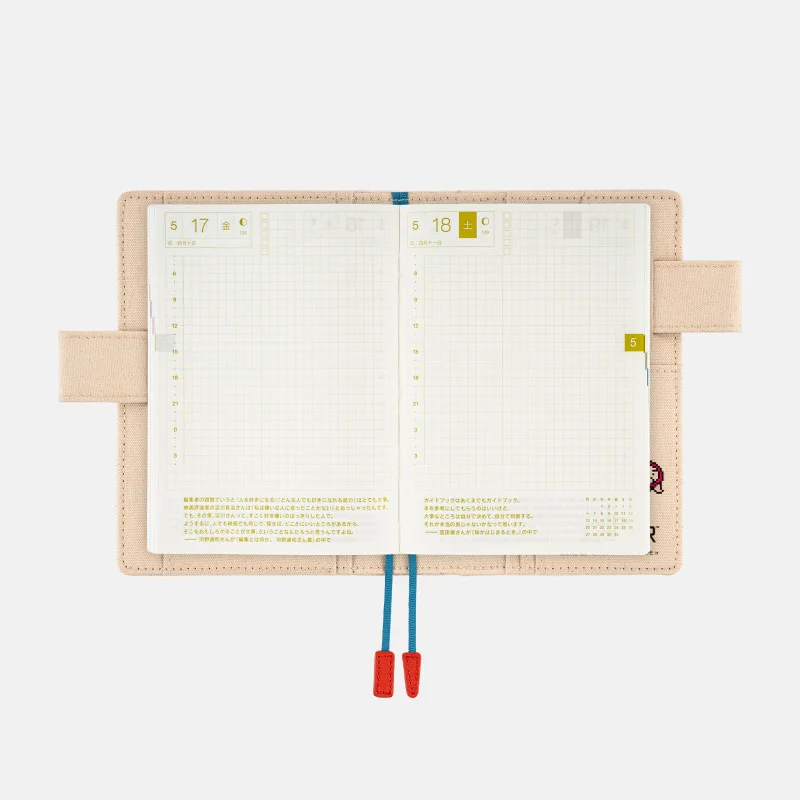 | Bonus Pages | Time Table / Graph Paper / Favorites / My 100 / An Interview with Myself / Seasonal Sweets to Make at Home / Caring for Your Eyes / Solar Terms / Emergency Preparedness / Conversion Chart / Getting the most of Hobonichi / Gifts / Age Table / Addresses (for 6 people) / Personal Notes |