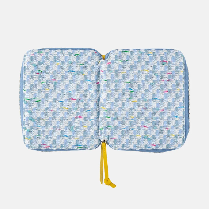 Each blue, white, and silver thread is woven horizontally, spreading downward, looking like sparkling waves in the summer sea. The threads of translucent red, green, blue, and yellow occasionally appear in between. The randomly placed pom-poms add a charm to the fabric.