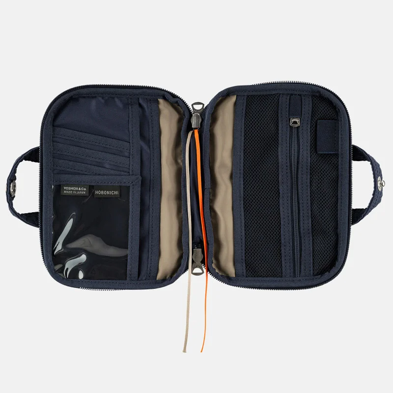 Open the zipper and you’ll see the combination of navy and gray for the cover interior. There are three card pockets and an additional, deeper pocket that’s clear so you can see what’s inside; there’s also a mesh pocket that closes with a zipper. You can carry everything you use on a daily basis alongside your techo. The pen-holder can store a slim pen; if you’ve got a thicker pen, you can store it by its clip.
