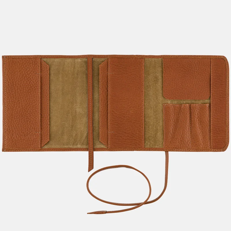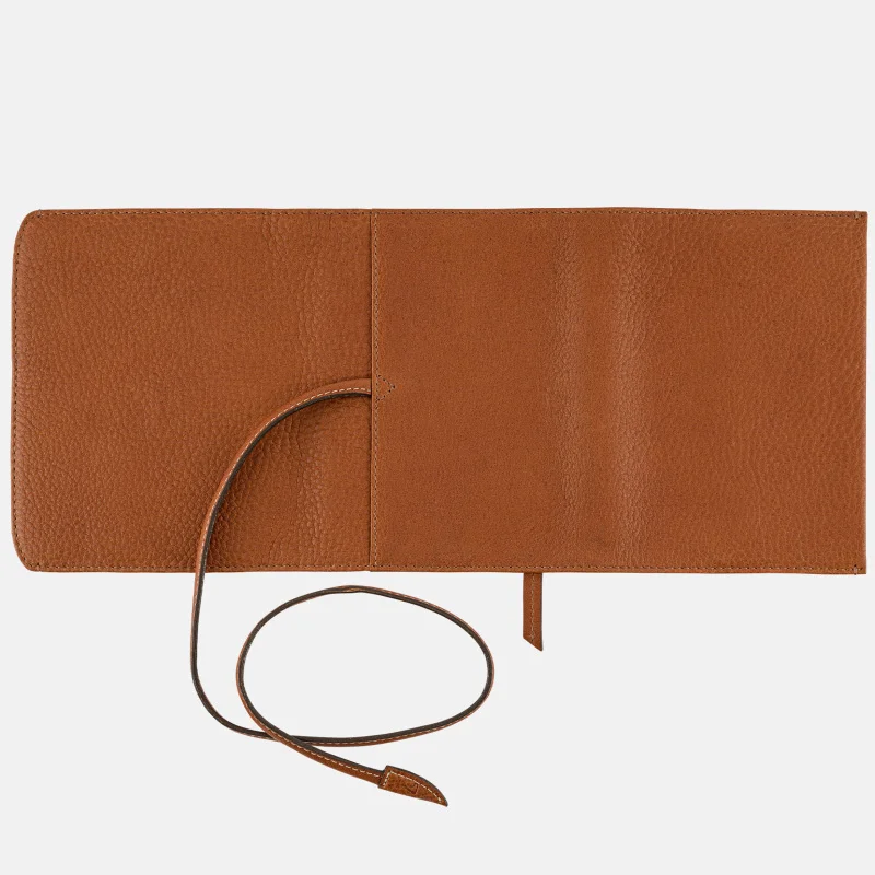 The cover is closed by wrapping a leather string around it. Enjoy taking your time to unwind the leather strap to open your techo and fastening it shut.