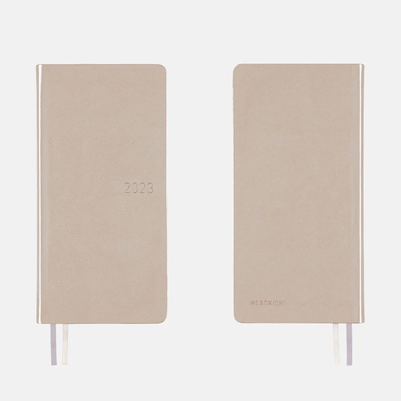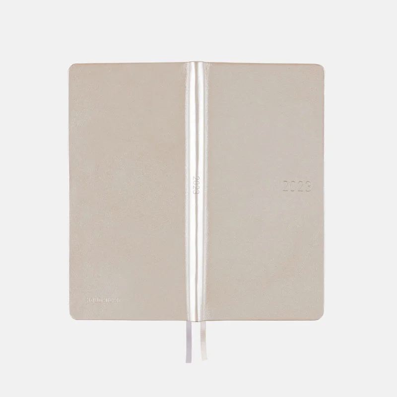 Silver White is made from cow leather, with a dazzling silver finish that gives the fine natural wrinkles of leather an expressive sparkle. Despite its gorgeous looks, it gives an impression of elegance rather than gaudiness. The year 2023 is foil-pressed in silver and matches well with the cover color.