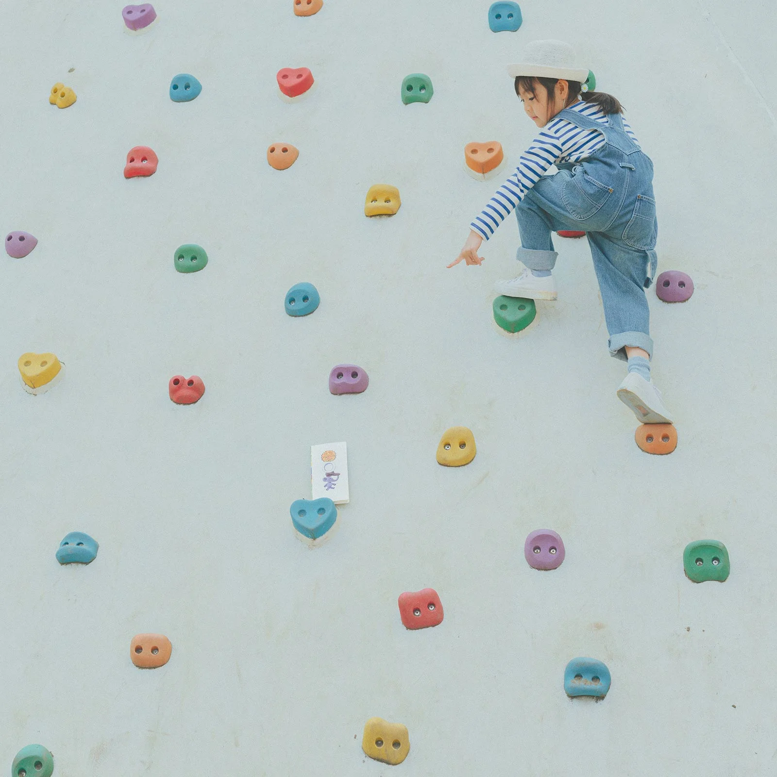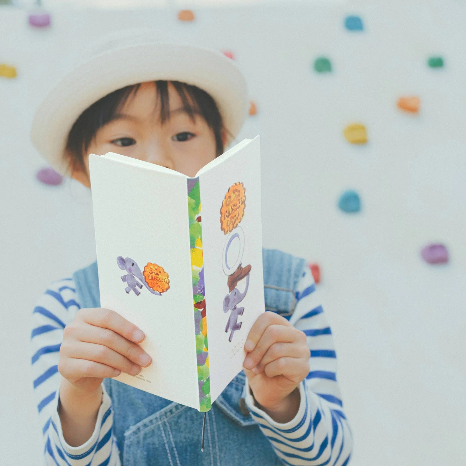 The cover has been constructed as a light, hardcover book with some give to it so it still bends. The base is off-white, and the book spine is filled with color.