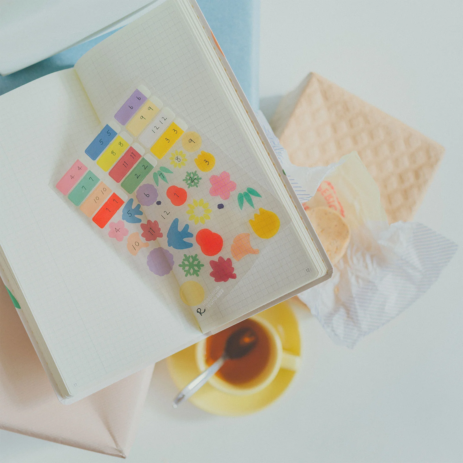 You can brighten up your techo by filling it with these colorful, semitransparent stickers that come in 12 colors. We recommend writing on the stickers with an oil-based pen because of the stickers’ glossy surface. By placing a sticker on the edge of the page, over the index block for the month, you can easily jump to each month.