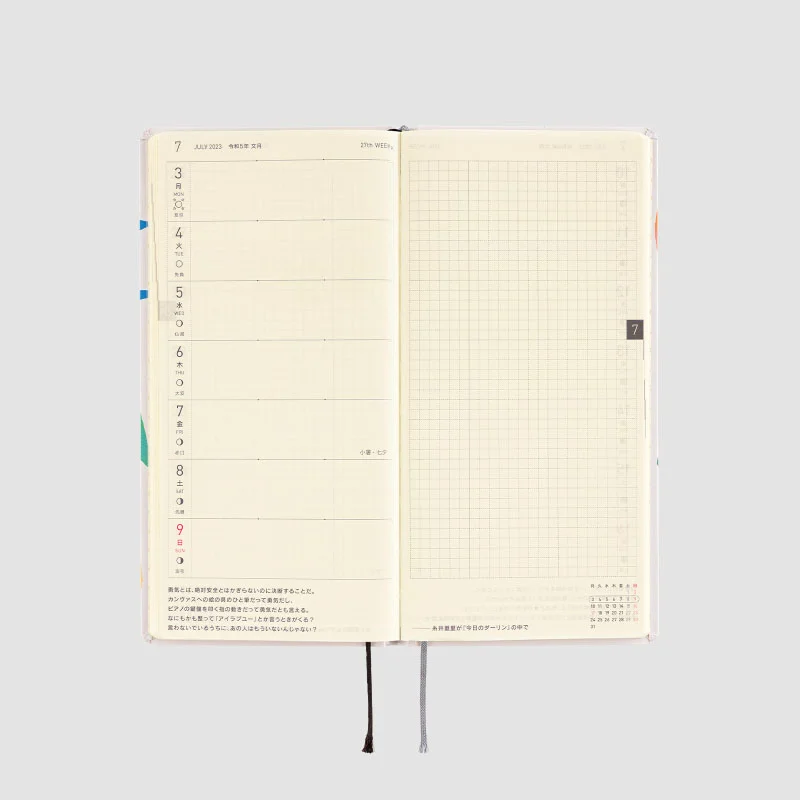 | Bonus Pages | Shorthand Note-Taking / Using Common Items to Measure Size / My 100 / Solar Terms / My Favorite Things / How to Better Enjoy Conversation / Emergency Preparedness / Age Table / Conversion Chart / Getting the most of Hobonichi / Contact List / Personal Notes |