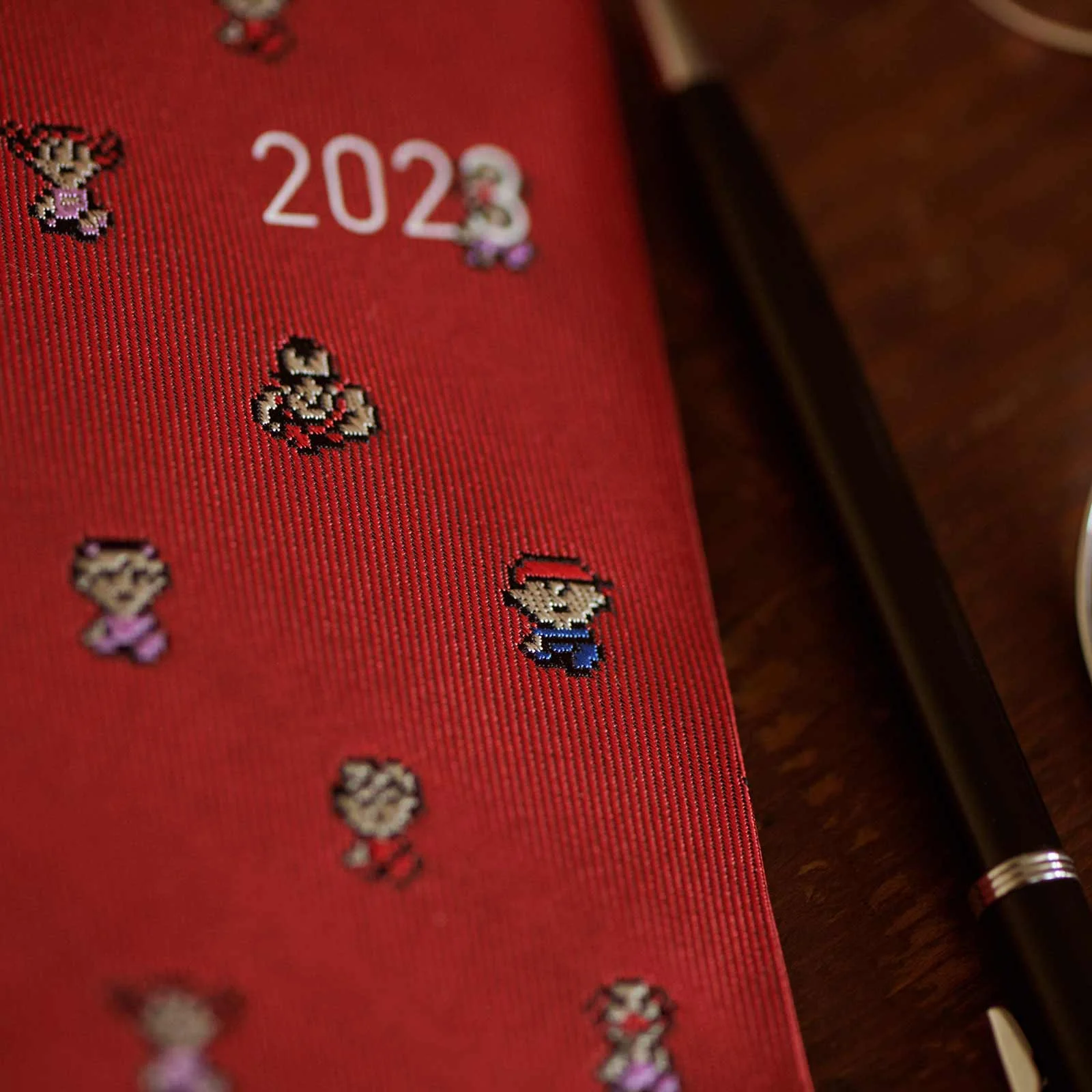The necktie fabric gives the cover its characteristic soft texture and shiny look. The year 2023 is printed in white.