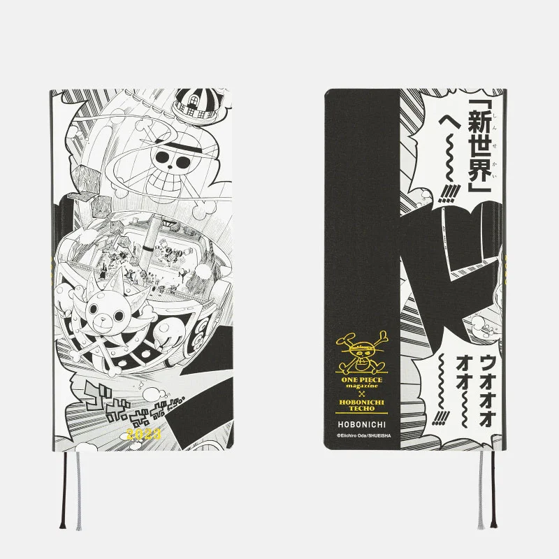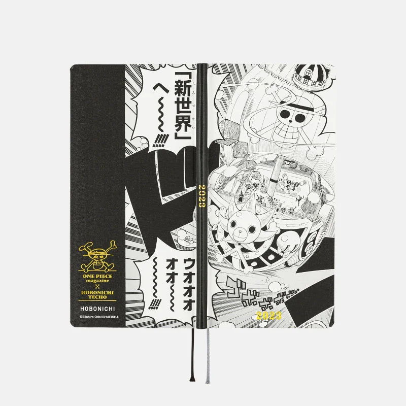 This design is pulled from the spread on pages 140-141 of Volume 66 from the Jump Comics books, and the back cover has a large print of Luffy’s phrase “To the New World!” The bottom half is black and foil-printed with the ONE PIECE magazine x Hobonichi logo.