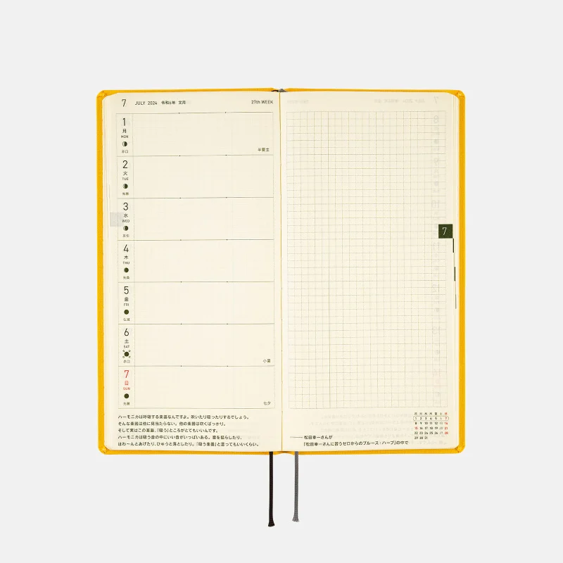The Weeks book has space for writing in plans or journal entries, and it also has 213 pages of grid paper memo pages in the back (217 pages in the English edition Weeks). The back of the book contains informational pages, including An Interview with Myself and Seasonal Sweets to Make at Home.