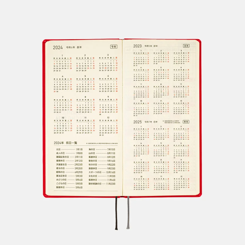| Listed Information | Week of the year / Rokuyo (traditional Japanese calendar) / Solar terms / Japanese holidays / Moon phase (weekly pages include every phase, monthly calendars only include full and new moon) |