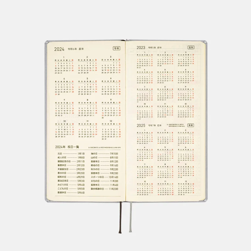 | Listed Information | Week of the year / Rokuyo (traditional Japanese calendar) / Solar terms / Japanese holidays / Moon phase (weekly pages include every phase, monthly calendars only include full and new moon) |
