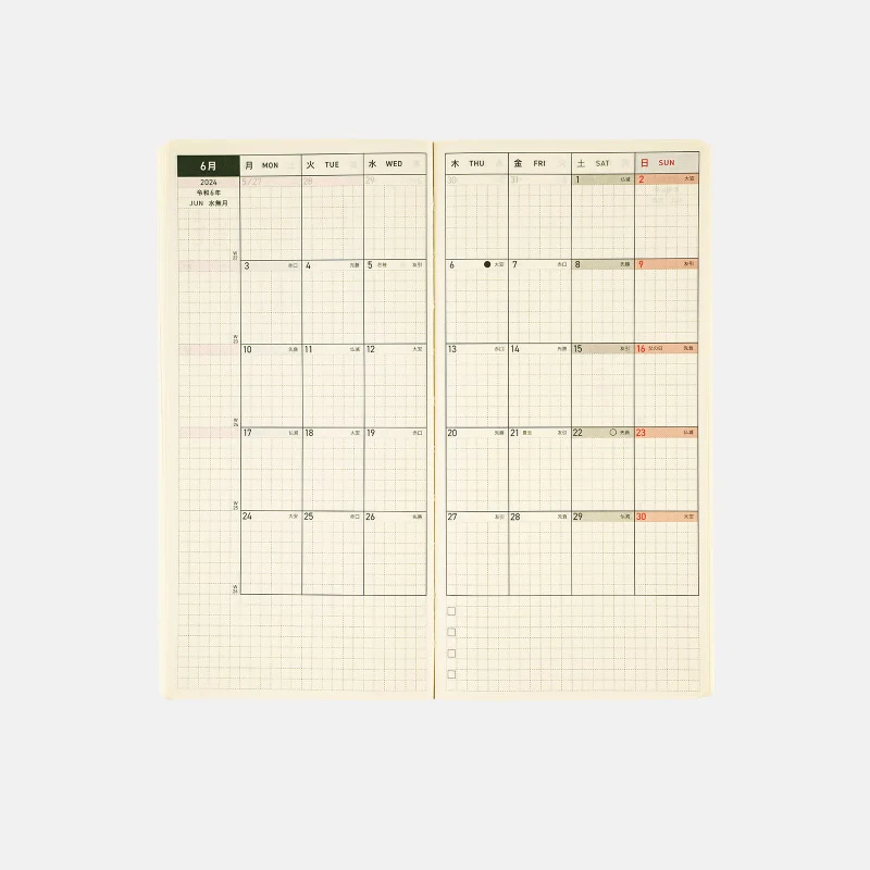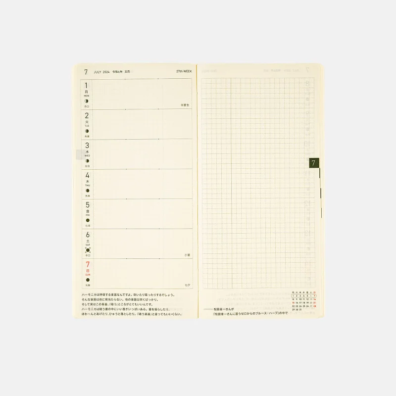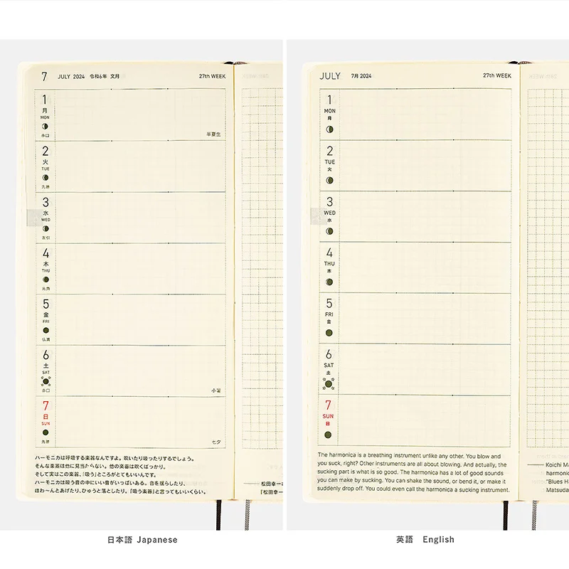 | Listed Information | Week of the year / Rokuyo (traditional Japanese calendar) / Solar terms / Japanese holidays / Moon phase (weekly pages include every phase, monthly calendars only include full and new moon) |