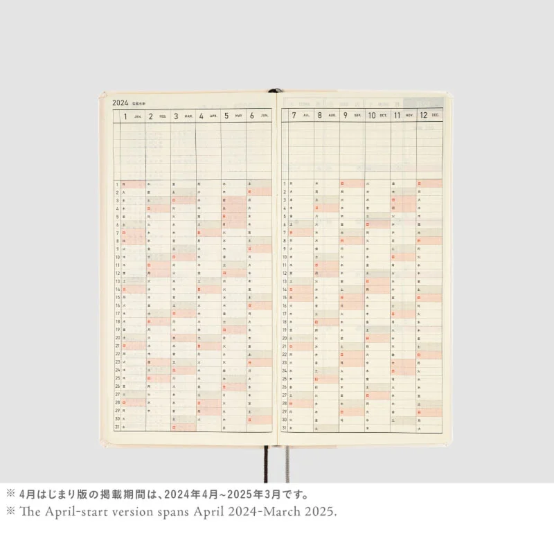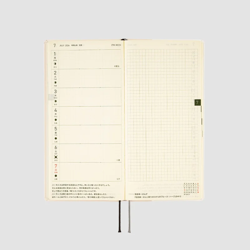 From the 2024 April-start version for the Weeks, the book uses thin and light yet durable Tomoe River S paper. The paper has supported the Hobonichi Techo for over 20 years with its special characteristics, but it’ll be undergoing an overhaul starting with the 2024 edition techos. The paper is more resistant to bleed through, lighter despite being the same thickness, and has a smoother surface by adjusting the fibers of the paper.