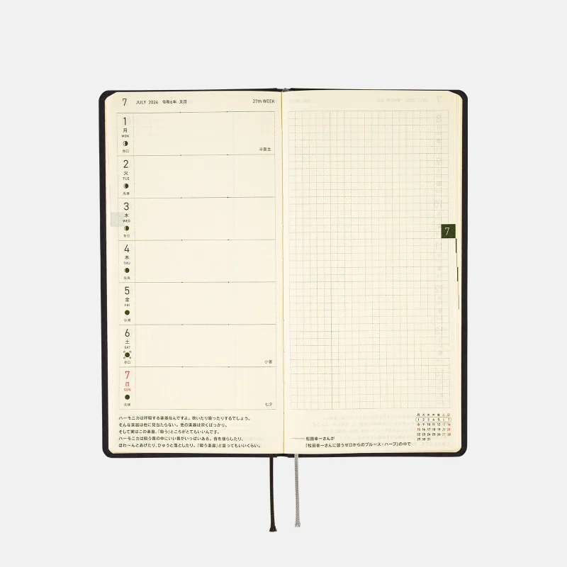 From the 2024 April-start version for the Weeks, the book uses thin and light yet durable Tomoe River S paper. The paper has supported the Hobonichi Techo for over 20 years with its special characteristics, but it’ll be undergoing an overhaul starting with the 2024 edition techos. The paper is more resistant to bleed through, lighter despite being the same thickness, and has a smoother surface by adjusting the fibers of the paper.