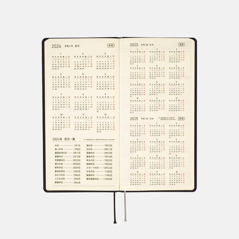 | Listed Information | Week of the year / Rokuyo (traditional Japanese calendar) / Solar terms / Japanese holidays / Moon phase (weekly pages include every phase, monthly calendars only include full and new moon) |