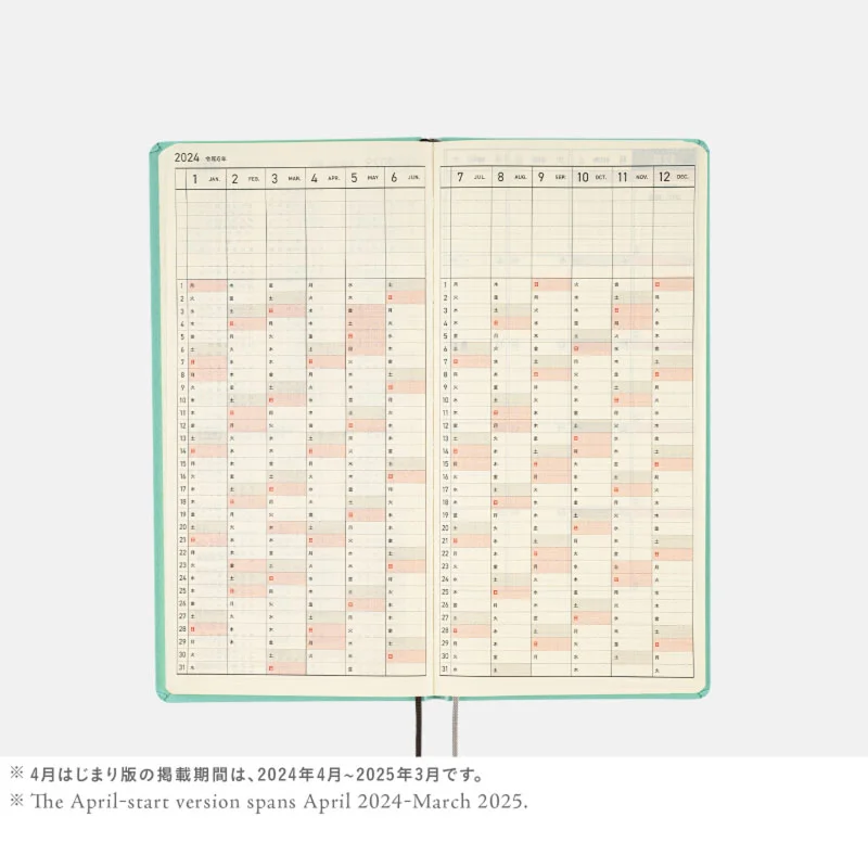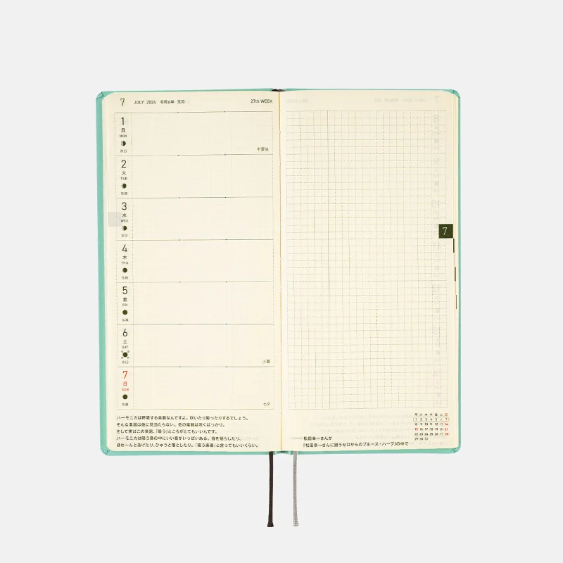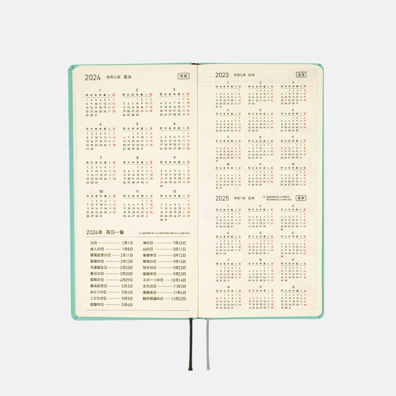 From the 2024 April-start version for the Weeks, the book uses thin and light yet durable Tomoe River S paper. The paper has supported the Hobonichi Techo for over 20 years with its special characteristics, but it’ll be undergoing an overhaul starting with the 2024 edition techos. The paper is more resistant to bleed through, lighter despite being the same thickness, and has a smoother surface by adjusting the fibers of the paper.