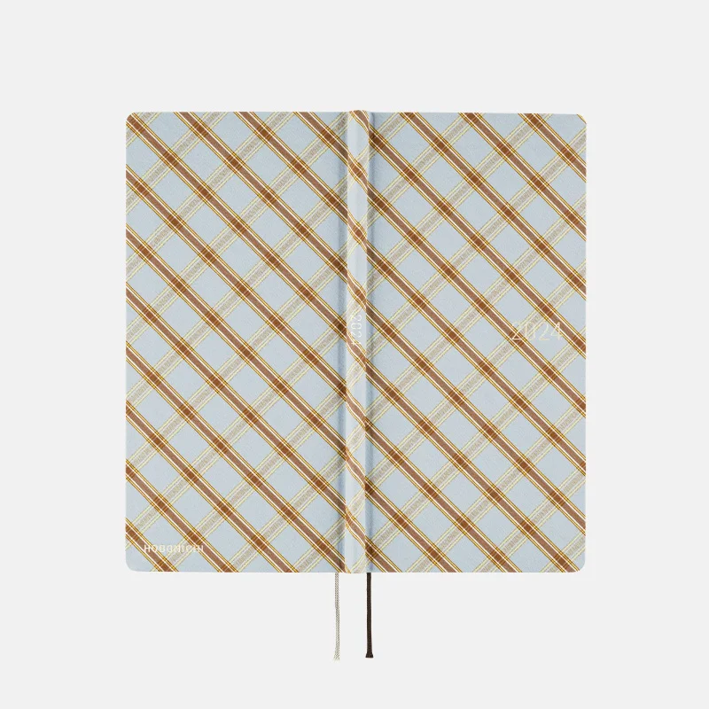 White and brown lines cross over a pale blue background. You will also find thin yellow lines when looking close up. The year 2024 is foil-pressed in silver, giving off a muted glow.