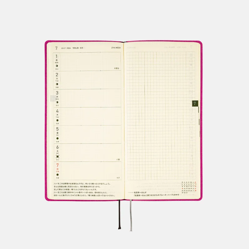 From the 2024 April-start version for the Weeks, the book uses thin and light yet durable Tomoe River S paper. The paper has supported the Hobonichi Techo for over 20 years with its special characteristics, but it’ll be undergoing an overhaul starting with the 2024 edition techos. The paper is more resistant to bleed through, lighter despite being the same thickness, and has a smoother surface by adjusting the fibers of the paper.