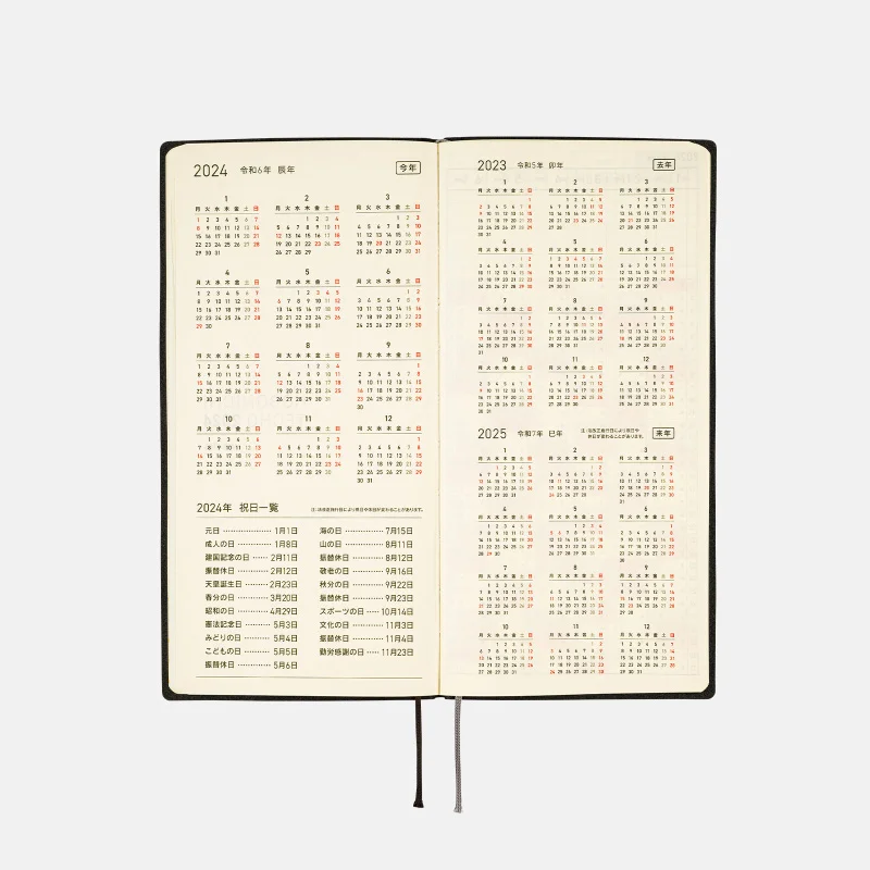 | Listed Information | Week of the year / Rokuyo (traditional Japanese calendar) / Solar terms / Japanese holidays / Moon phase (weekly pages include every phase, monthly calendars only include full and new moon) |